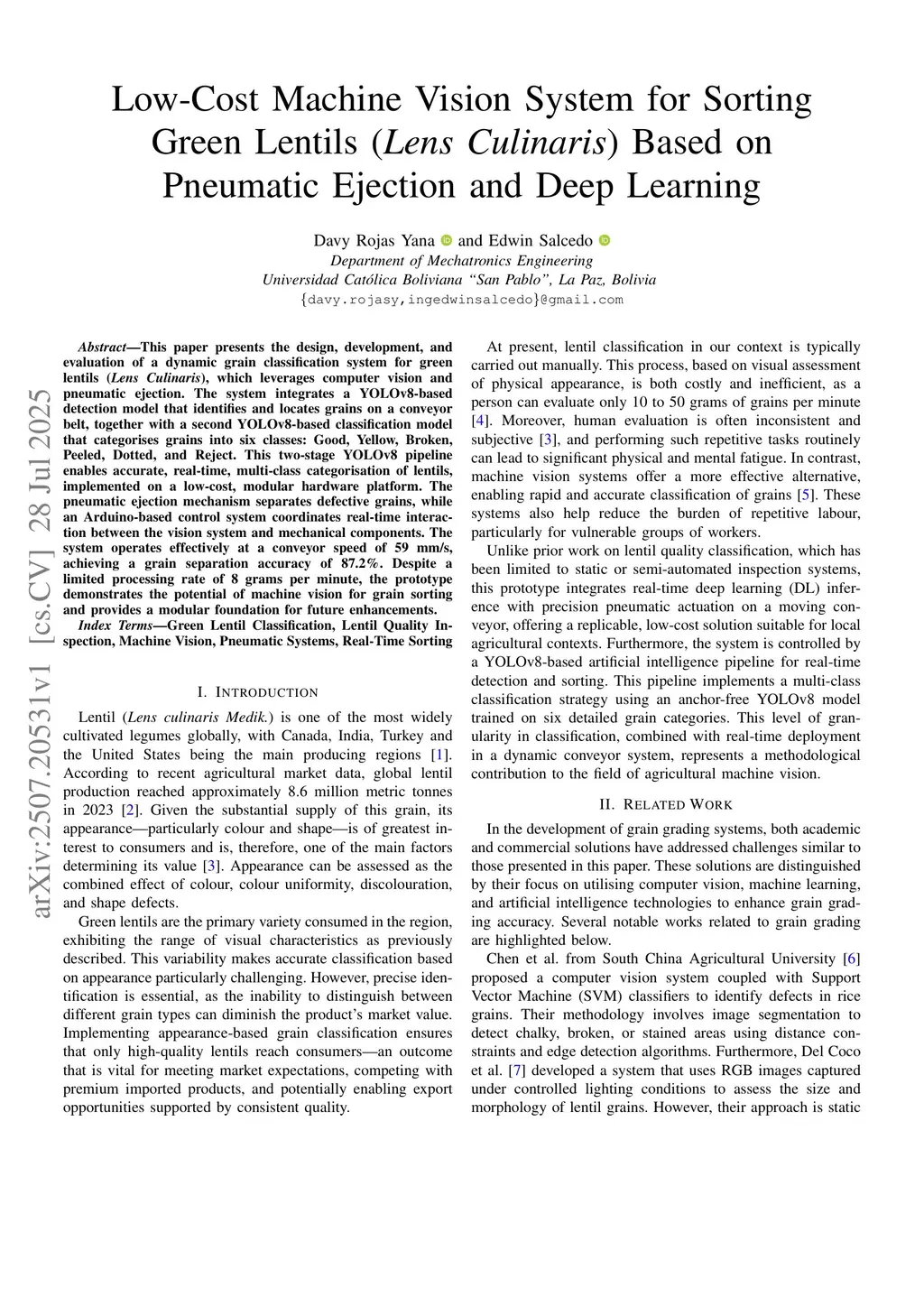 Low-Cost Machine Vision System for Sorting Green Lentils (Lens Culinaris) Based on Pneumatic Ejection and Deep Learning