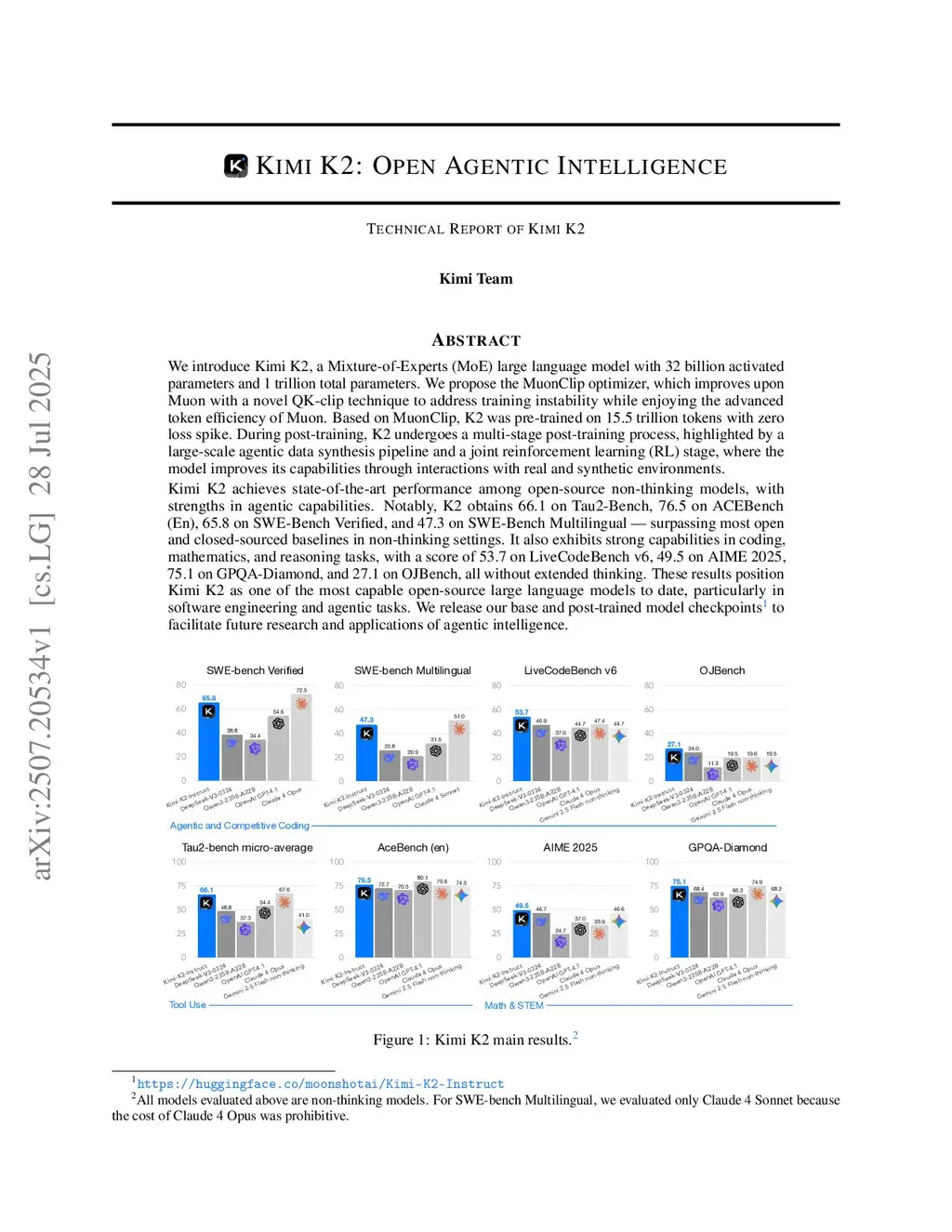 We introduce Kimi K2, a Mixture-of-Experts (MoE) large language model with 32 billion activated parameters and 1 trillion total parameters. We propose the MuonClip optimizer, which improves upon Muon with a novel QK-clip technique to address training instability while enjoying the advanced token efficiency of Muon. Based on MuonClip, K2 was pre-trained on 15.5 trillion tokens with zero loss spike. During post-training, K2 undergoes a multi-stage post-training process, highlighted by a large-scale agentic data synthesis pipeline and a joint reinforcement learning (RL) stage, where the model improves its capabilities through interactions with real and synthetic environments.Kimi K2 achieves state-of-the-art performance among open-source non-thinking models, with strengths in agentic capabilities. Notably, K2 obtains 66.1 on Tau2-Bench, 76.5 on ACEBench (En), 65.8 on SWE-Bench Verified, and 47.3 on SWE-Bench Multilingual -- surpassing most open and closed-sourced baselines in non-thinking settings. It also exhibits strong capabilities in coding, mathematics, and reasoning tasks, with a score of 53.7 on LiveCodeBench v6, 49.5 on AIME 2025, 75.1 on GPQA-Diamond, and 27.1 on OJBench, all without extended thinking. These results position Kimi K2 as one of the most capable open-source large language models to date, particularly in software engineering and agentic tasks. We release our base and post-trained model checkpoints to facilitate future research and applications of agentic intelligence.
