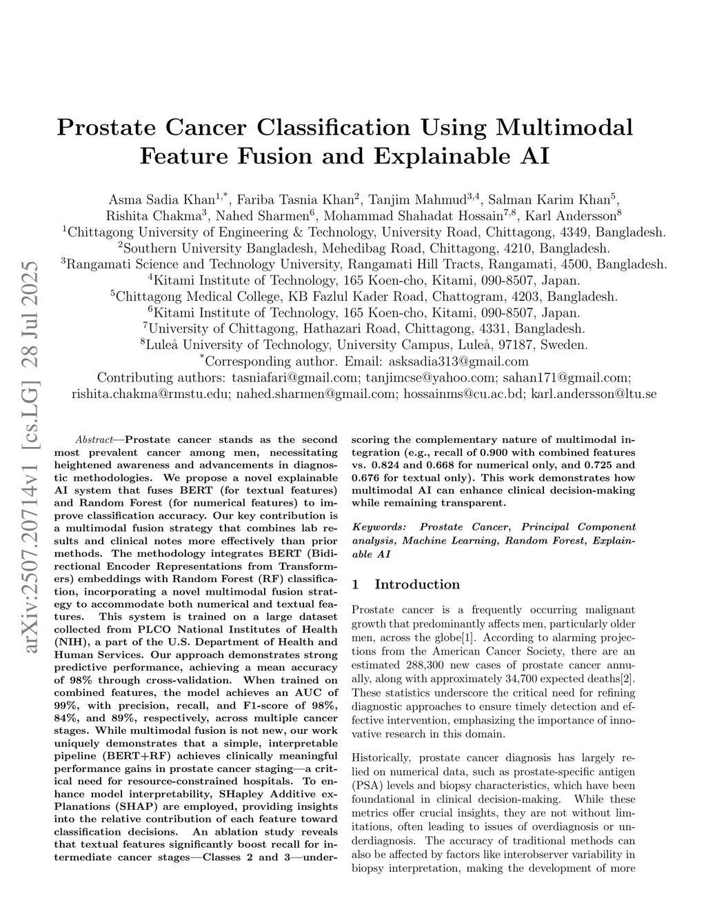 Prostate cancer, the second most prevalent male malignancy, requires advanced diagnostic tools. We propose an explainable AI system combining BERT (for textual clinical notes) and Random Forest (for numerical lab data) through a novel multimodal fusion strategy, achieving superior classification performance on PLCO-NIH dataset (98% accuracy, 99% AUC). While multimodal fusion is established, our work demonstrates that a simple yet interpretable BERT+RF pipeline delivers clinically significant improvements - particularly for intermediate cancer stages (Class 2/3 recall: 0.900 combined vs 0.824 numerical/0.725 textual). SHAP analysis provides transparent feature importance rankings, while ablation studies prove textual features' complementary value. This accessible approach offers hospitals a balance of high performance (F1=89%), computational efficiency, and clinical interpretability - addressing critical needs in prostate cancer diagnostics.