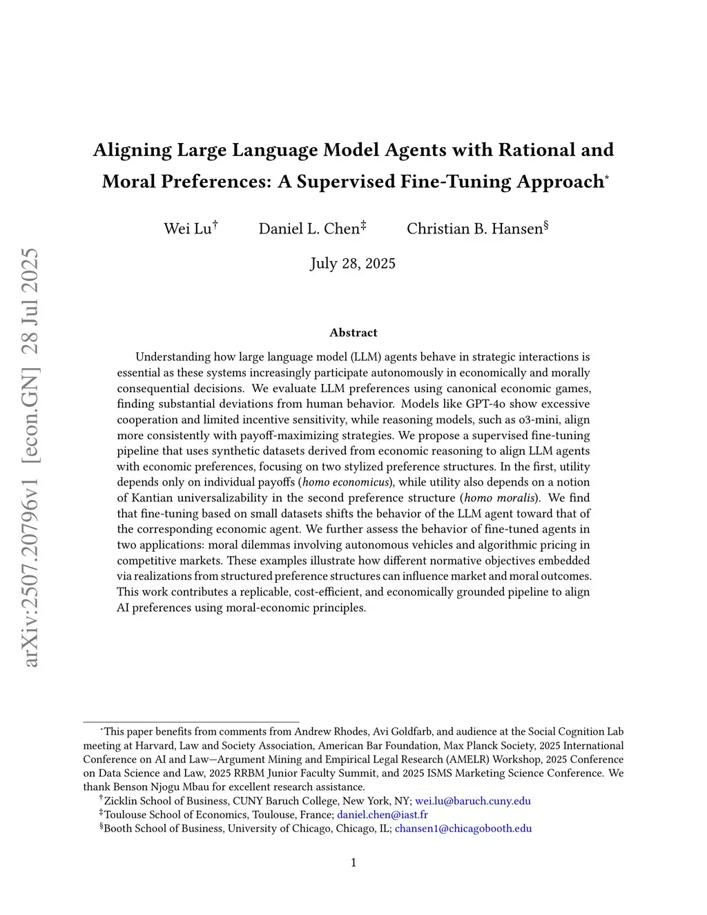 As large language models (LLMs) increasingly act as autonomous agents in markets and organizations, their behavior in strategic environments becomes economically consequential. We document that off-the-shelf LLM agents exhibit systematic deviations from payoff-sensitive behavior in canonical economic games, including excessive cooperation and limited responsiveness to incentives. We introduce a supervised fine-tuning approach that aligns agent behavior with explicit economic preferences. Specifically, we generate optimal strategies under two stylized utility specifications, homo economicus, which maximizes self-interest, and homo moralis, which incorporates Kantian universalizability, and use these utility-implied reasoning and strategies to guide fine-tuning. Fine-tuning on a small, theory-driven synthetic dataset induces persistent and interpretable shifts in strategic behavior. In applications to moral dilemmas and repeated duopoly pricing, agents aligned to different preference structures produce systematically distinct equilibrium outcomes and pricing dynamics. These results frame AI alignment in multi-agent settings as an objective-design problem and illustrate how economic theory can guide the design of strategically coherent AI agents.