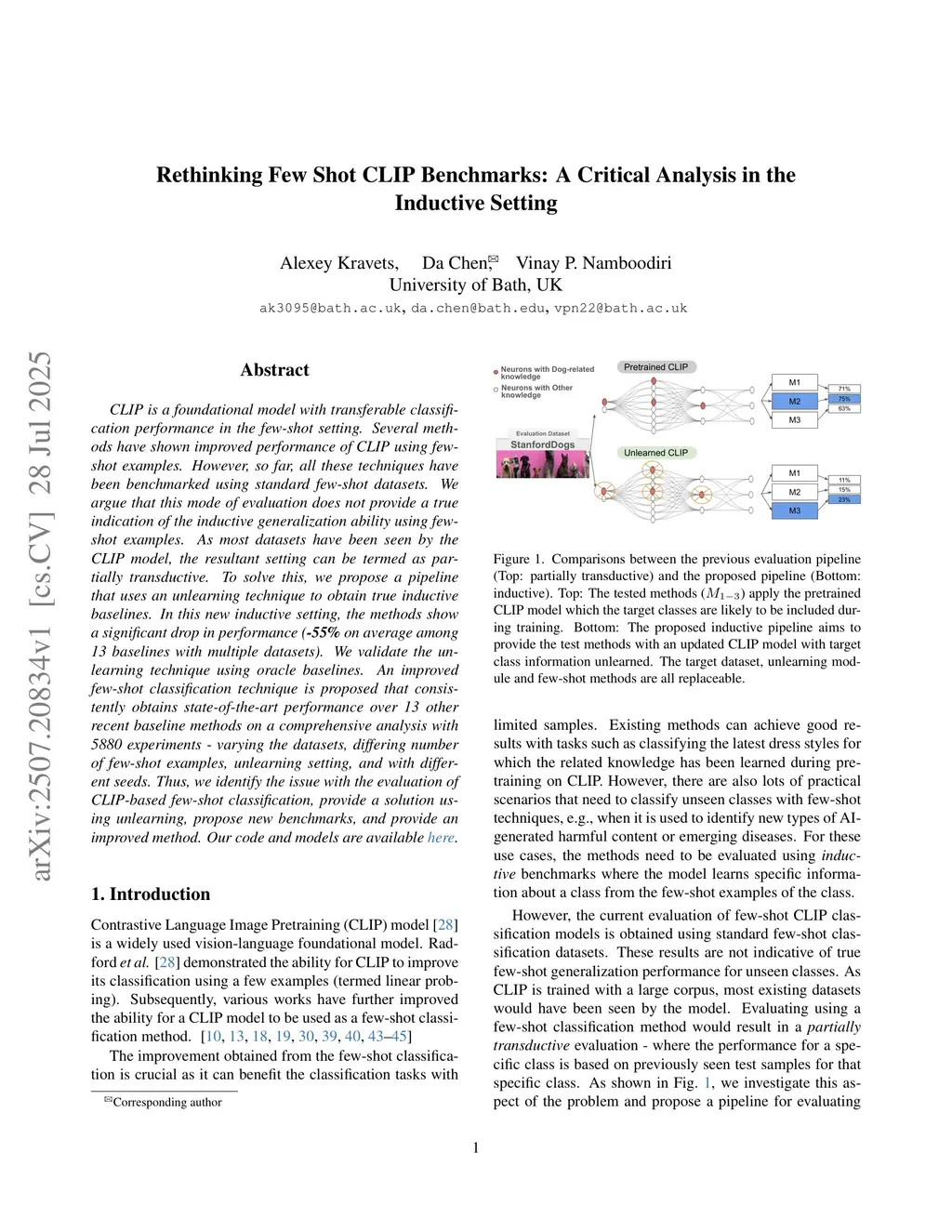 CLIP is a foundational model with transferable classification performance in the few-shot setting. Several methods have shown improved performance of CLIP using few-shot examples. However, so far, all these techniques have been benchmarked using standard few-shot datasets. We argue that this mode of evaluation does not provide a true indication of the inductive generalization ability using few-shot examples. As most datasets have been seen by the CLIP model, the resultant setting can be termed as partially transductive. To solve this, we propose a pipeline that uses an unlearning technique to obtain true inductive baselines. In this new inductive setting, the methods show a significant drop in performance (-55% on average among 13 baselines with multiple datasets). We validate the unlearning technique using oracle baselines. An improved few-shot classification technique is proposed that consistently obtains state-of-the-art performance over 13 other recent baseline methods on a comprehensive analysis with 5880 experiments - varying the datasets, differing number of few-shot examples, unlearning setting, and with different seeds. Thus, we identify the issue with the evaluation of CLIP-based few-shot classification, provide a solution using unlearning, propose new benchmarks, and provide an improved method.