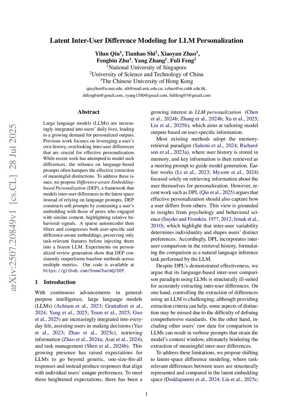 Large language models (LLMs) are increasingly integrated into users' daily lives, leading to a growing demand for personalized outputs. Previous work focuses on leveraging a user's own history, overlooking inter-user differences that are crucial for effective personalization. While recent work has attempted to model such differences, the reliance on language-based prompts often hampers the effective extraction of meaningful distinctions. To address these issues, we propose Difference-aware Embedding-based Personalization (DEP), a framework that models inter-user differences in the latent space instead of relying on language prompts. DEP constructs soft prompts by contrasting a user's embedding with those of peers who engaged with similar content, highlighting relative behavioral signals. A sparse autoencoder then filters and compresses both user-specific and difference-aware embeddings, preserving only task-relevant features before injecting them into a frozen LLM. Experiments on personalized review generation show that DEP consistently outperforms baseline methods across multiple metrics. Our code is available atthis https URL.