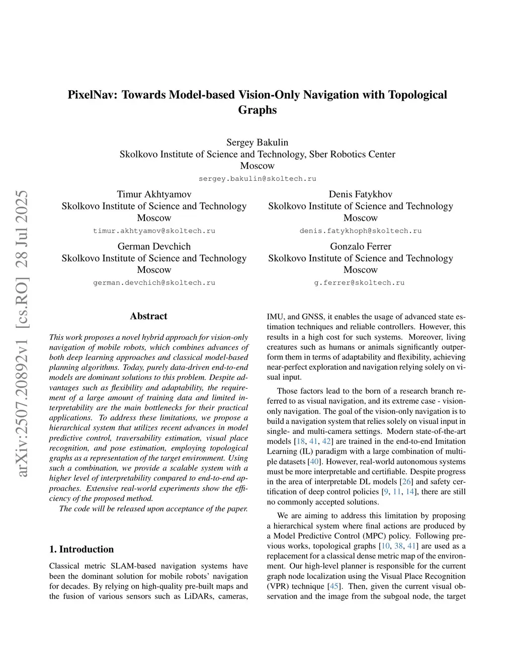 PixelNav: Towards Model-based Vision-Only Navigation with Topological Graphs