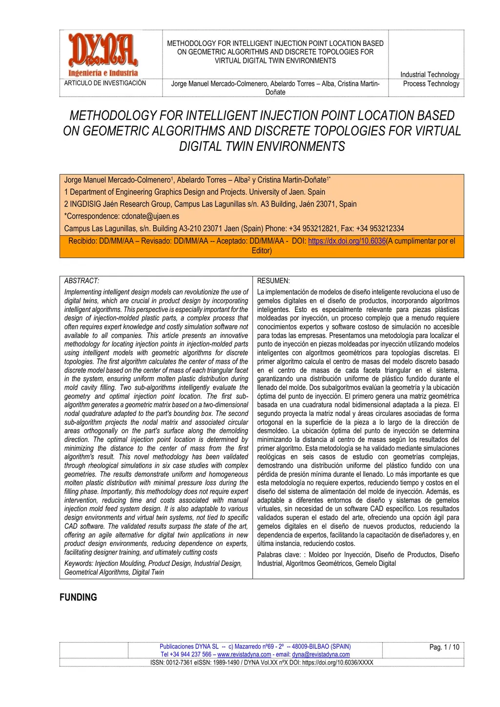 This article presents an innovative methodology for locating injection points in injection-molded parts using intelligent models with geometric algorithms for discrete topologies. The first algorithm calculates the center of mass of the discrete model based on the center of mass of each triangular facet in the system, ensuring uniform molten plastic distribution during mold cavity filling. Two sub-algorithms intelligently evaluate the geometry and optimal injection point location. The first sub-algorithm generates a geometric matrix based on a two-dimensional nodal quadrature adapted to the part's bounding box. The second sub-algorithm projects the nodal matrix and associated circular areas orthogonally on the part's surface along the demolding direction. The optimal injection point location is determined by minimizing the distance to the center of mass from the first algorithm's result. This novel methodology has been validated through rheological simulations in six case studies with complex geometries. The results demonstrate uniform and homogeneous molten plastic distribution with minimal pressure loss during the filling phase. Importantly, this methodology does not require expert intervention, reducing time and costs associated with manual injection mold feed system design. It is also adaptable to various design environments and virtual twin systems, not tied to specific CAD software. The validated results surpass the state of the art, offering an agile alternative for digital twin applications in new product design environments, reducing dependence on experts, facilitating designer training, and ultimately cutting costs