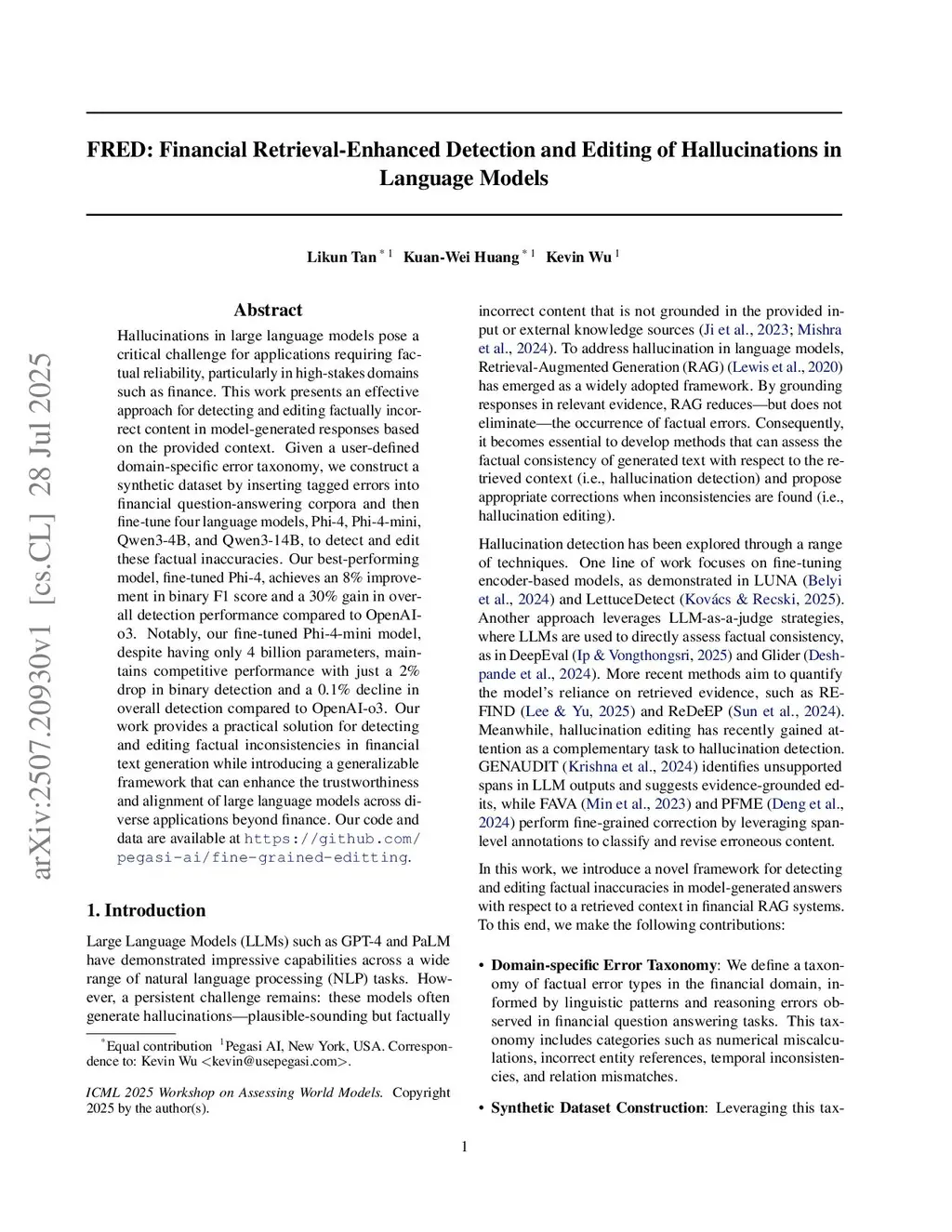 Hallucinations in large language models pose a critical challenge for applications requiring factual reliability, particularly in high-stakes domains such as finance. This work presents an effective approach for detecting and editing factually incorrect content in model-generated responses based on the provided context. Given a user-defined domain-specific error taxonomy, we construct a synthetic dataset by inserting tagged errors into financial question-answering corpora and then fine-tune four language models, Phi-4, Phi-4-mini, Qwen3-4B, and Qwen3-14B, to detect and edit these factual inaccuracies. Our best-performing model, fine-tuned Phi-4, achieves an 8% improvement in binary F1 score and a 30% gain in overall detection performance compared to OpenAI-o3. Notably, our fine-tuned Phi-4-mini model, despite having only 4 billion parameters, maintains competitive performance with just a 2% drop in binary detection and a 0.1% decline in overall detection compared to OpenAI-o3. Our work provides a practical solution for detecting and editing factual inconsistencies in financial text generation while introducing a generalizable framework that can enhance the trustworthiness and alignment of large language models across diverse applications beyond finance. Our code and data are available atthis https URL.