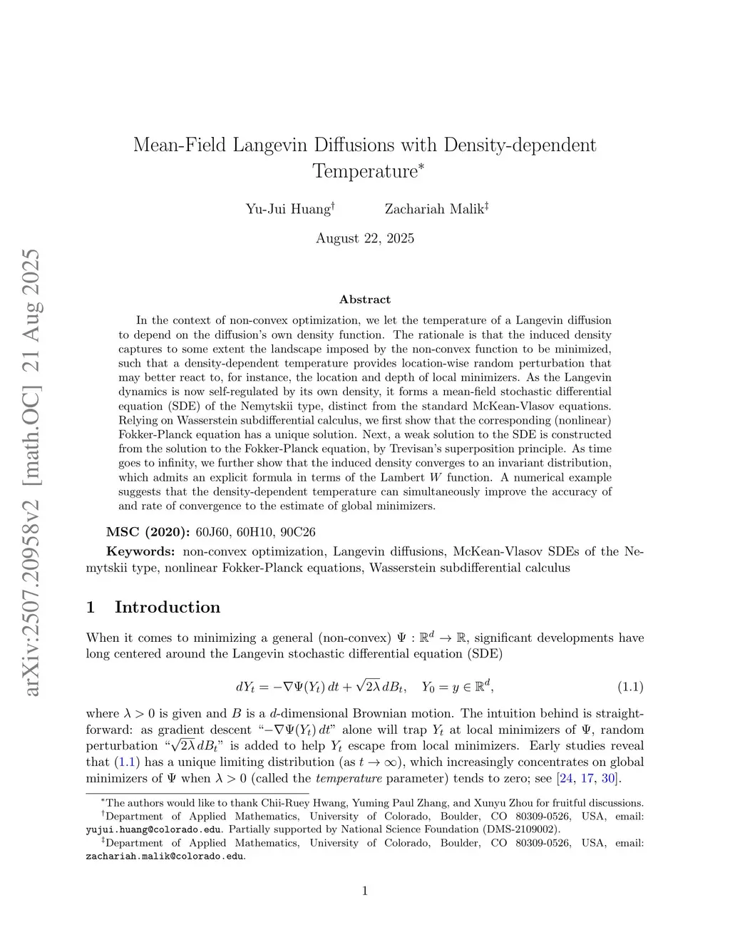 In the context of non-convex optimization, we let the temperature of a Langevin diffusion to depend on the diffusion's own density function. The rationale is that the induced density captures to some extent the landscape imposed by the non-convex function to be minimized, such that a density-dependent temperature provides location-wise random perturbation that may better react to, for instance, the location and depth of local minimizers. As the Langevin dynamics is now self-regulated by its own density, it forms a mean-field stochastic differential equation (SDE) of the Nemytskii type, distinct from the standard McKean-Vlasov equations. Relying on Wasserstein subdifferential calculus, we first show that the corresponding (nonlinear) Fokker-Planck equation has a unique solution. Next, a weak solution to the SDE is constructed from the solution to the Fokker-Planck equation, by Trevisan's superposition principle. As time goes to infinity, we further show that the induced density converges to an invariant distribution, which admits an explicit formula in terms of the Lambert function. A numerical example suggests that the density-dependent temperature can simultaneously improve the accuracy of and rate of convergence to the estimate of global minimizers.