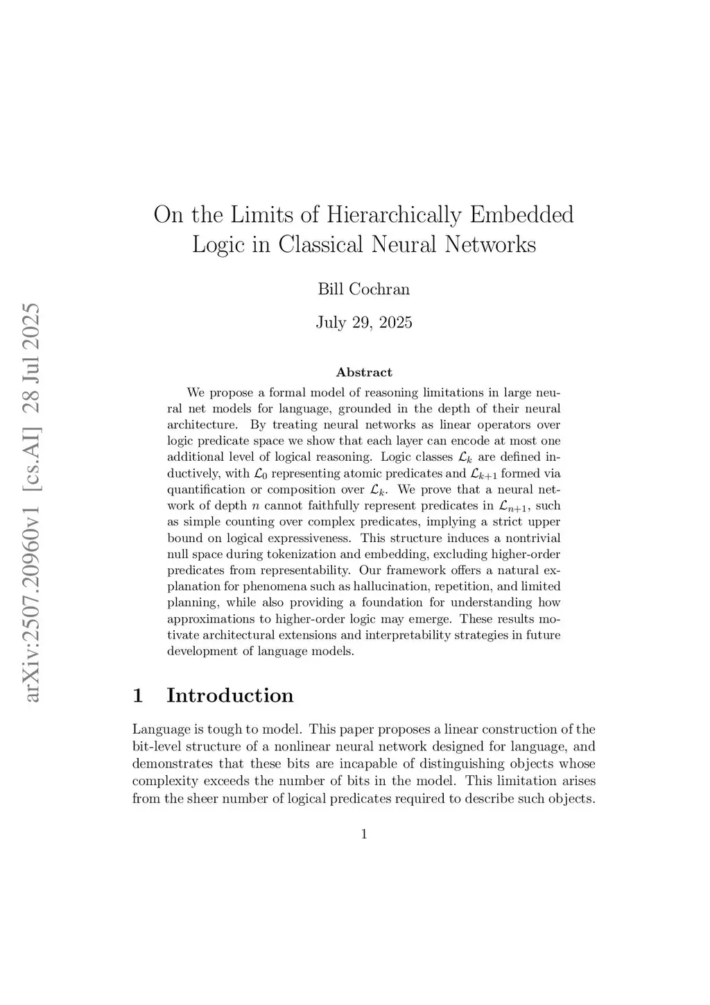 We propose a formal model of reasoning limitations in large neural net models for language, grounded in the depth of their neural architecture. By treating neural networks as linear operators over logic predicate space we show that each layer can encode at most one additional level of logical reasoning. We prove that a neural network of depth a particular depth cannot faithfully represent predicates in a one higher order logic, such as simple counting over complex predicates, implying a strict upper bound on logical expressiveness. This structure induces a nontrivial null space during tokenization and embedding, excluding higher-order predicates from representability. Our framework offers a natural explanation for phenomena such as hallucination, repetition, and limited planning, while also providing a foundation for understanding how approximations to higher-order logic may emerge. These results motivate architectural extensions and interpretability strategies in future development of language models.