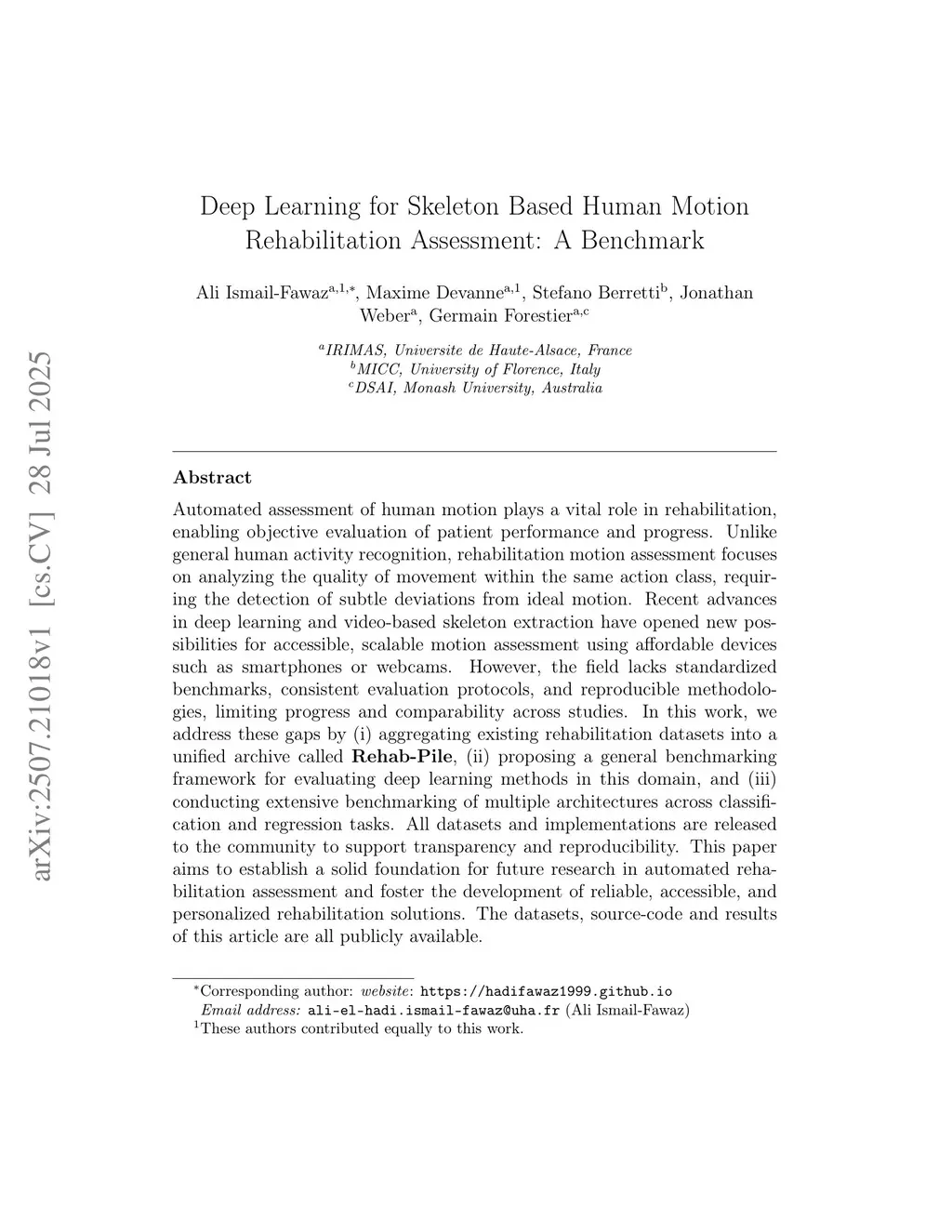 Deep Learning for Skeleton Based Human Motion Rehabilitation Assessment: A Benchmark