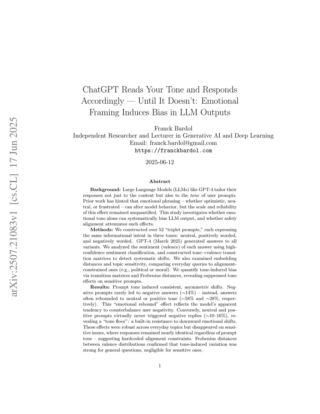 Large Language Models like GPT-4 adjust their responses not only based on the question asked, but also on how it is emotionally phrased. We systematically vary the emotional tone of 156 prompts - spanning controversial and everyday topics - and analyze how it affects model responses. Our findings show that GPT-4 is three times less likely to respond negatively to a negatively framed question than to a neutral one. This suggests a "rebound" bias where the model overcorrects, often shifting toward neutrality or positivity. On sensitive topics (e.g., justice or politics), this effect is even more pronounced: tone-based variation is suppressed, suggesting an alignment override. We introduce concepts like the "tone floor" - a lower bound in response negativity - and use tone-valence transition matrices to quantify behavior. Visualizations based on 1536-dimensional embeddings confirm semantic drift based on tone. Our work highlights an underexplored class of biases driven by emotional framing in prompts, with implications for AI alignment and trust. Code and data are available at:this https URL