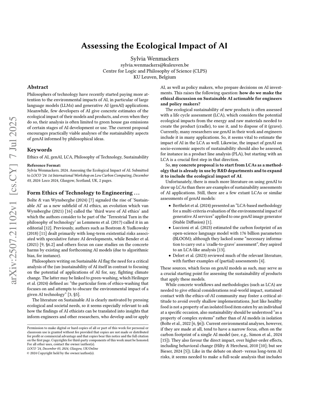 Philosophers of technology have recently started paying more attention to the environmental impacts of AI, in particular of large language models (LLMs) and generative AI (genAI) applications. Meanwhile, few developers of AI give concrete estimates of the ecological impact of their models and products, and even when they do so, their analysis is often limited to green house gas emissions of certain stages of AI development or use. The current proposal encourages practically viable analyses of the sustainability aspects of genAI informed by philosophical ideas.
