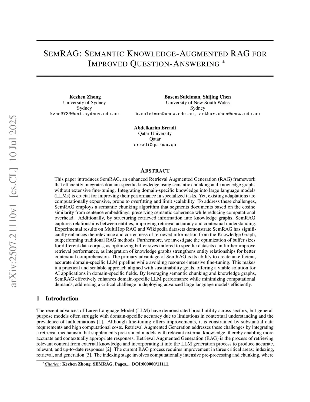 SemRAG: Semantic Knowledge-Augmented RAG for Improved Question-Answering