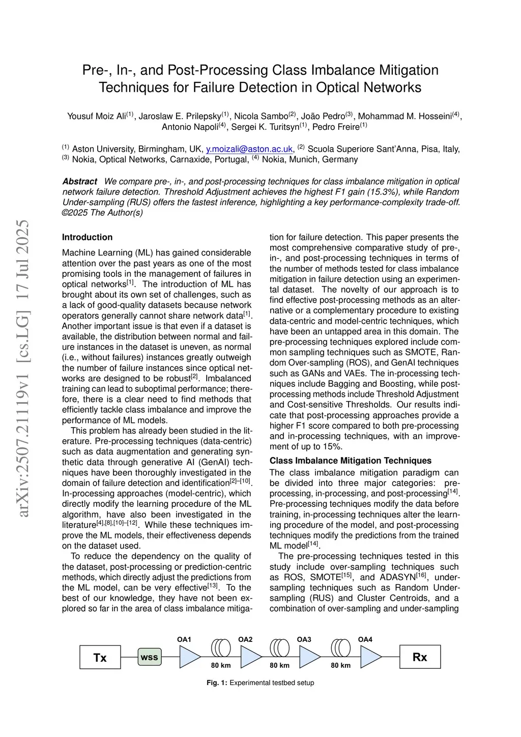 We compare pre-, in-, and post-processing techniques for class imbalance mitigation in optical network failure detection. Threshold Adjustment achieves the highest F1 gain (15.3%), while Random Under-sampling (RUS) offers the fastest inference, highlighting a key performance-complexity trade-off.