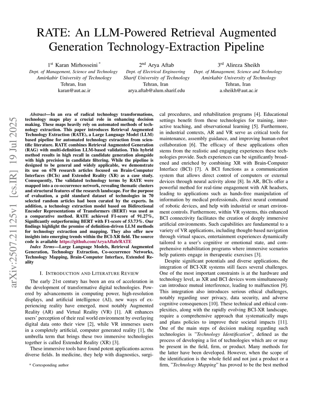 In an era of radical technology transformations, technology maps play a crucial role in enhancing decision making. These maps heavily rely on automated methods of technology extraction. This paper introduces Retrieval Augmented Technology Extraction (RATE), a Large Language Model (LLM) based pipeline for automated technology extraction from scientific literature. RATE combines Retrieval Augmented Generation (RAG) with multi-definition LLM-based validation. This hybrid method results in high recall in candidate generation alongside with high precision in candidate filtering. While the pipeline is designed to be general and widely applicable, we demonstrate its use on 678 research articles focused on Brain-Computer Interfaces (BCIs) and Extended Reality (XR) as a case study. Consequently, The validated technology terms by RATE were mapped into a co-occurrence network, revealing thematic clusters and structural features of the research landscape. For the purpose of evaluation, a gold standard dataset of technologies in 70 selected random articles had been curated by the experts. In addition, a technology extraction model based on Bidirectional Encoder Representations of Transformers (BERT) was used as a comparative method. RATE achieved F1-score of 91.27%, Significantly outperforming BERT with F1-score of 53.73%. Our findings highlight the promise of definition-driven LLM methods for technology extraction and mapping. They also offer new insights into emerging trends within the BCI-XR field. The source code is availablethis https URL
