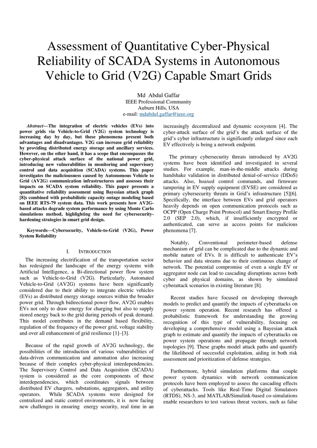 The integration of electric vehicles (EVs) into power grids via Vehicle-to-Grid (V2G) system technology is increasing day by day, but these phenomena present both advantages and disadvantages. V2G can increase grid reliability by providing distributed energy storage and ancillary services. However, on the other hand, it has a scope that encompasses the cyber-physical attack surface of the national power grid, introducing new vulnerabilities in monitoring and supervisory control and data acquisition (SCADA) systems. This paper investigates the maliciousness caused by Autonomous Vehicle to Grid (AV2G) communication infrastructures and assesses their impacts on SCADA system reliability. This paper presents a quantitative reliability assessment using Bayesian attack graph combined with probabilistic capacity outage modeling based on IEEE RTS-79 system data. This work presents how AV2G-based attacks degrade system performance by using Monte Carlo simulations method, highlighting the need for cybersecurity-hardening strategies in smart grid design.