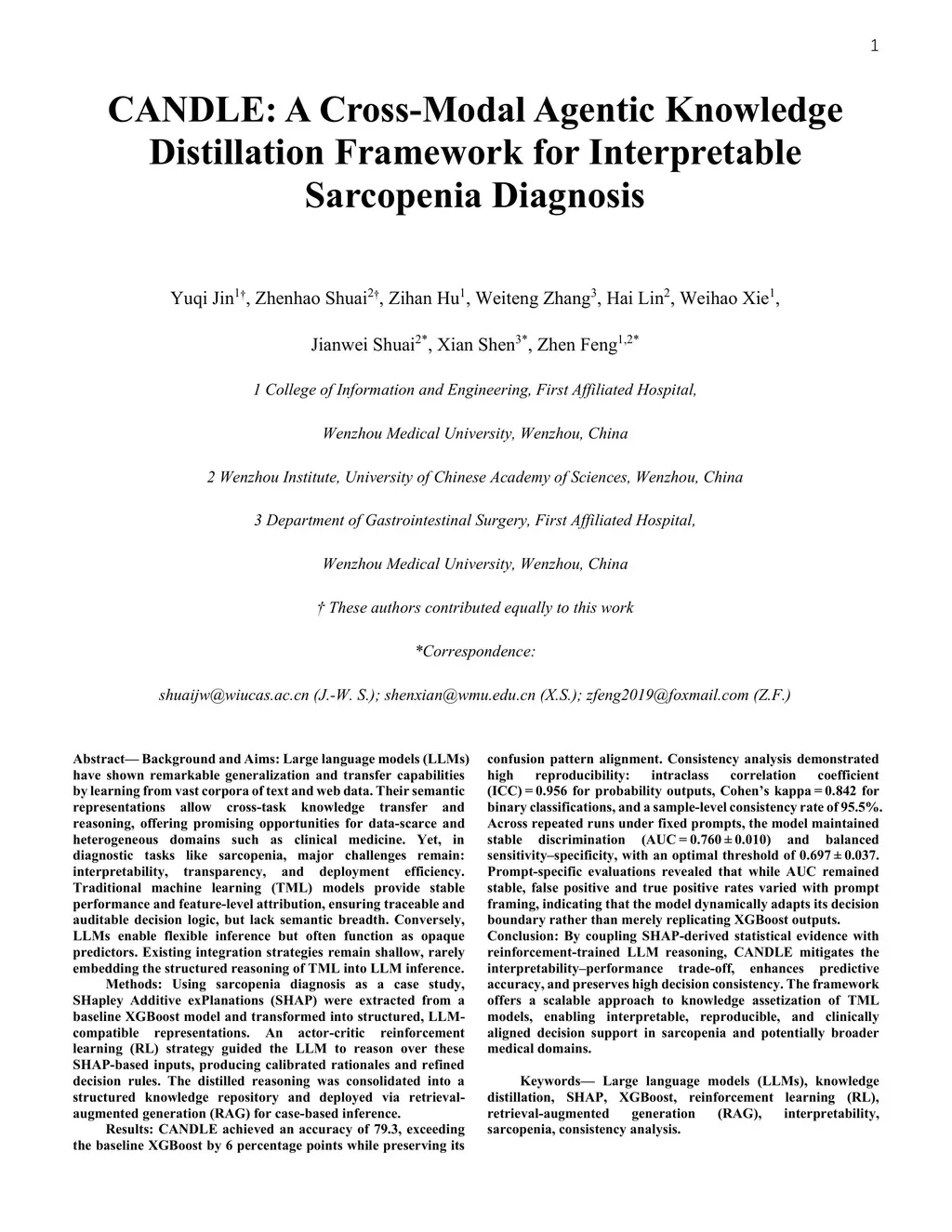 Background and Aims: Large language models (LLMs) have shown remarkable generalization and transfer capabilities by learning from vast corpora of text and web data. Their semantic representations allow cross-task knowledge transfer and reasoning, offering promising opportunities for data-scarce and heterogeneous domains such as clinical medicine. Yet, in diagnostic tasks like sarcopenia, major challenges remain: interpretability, transparency, and deployment efficiency. Traditional machine learning (TML) models provide stable performance and feature-level attribution, ensuring traceable and auditable decision logic, but lack semantic breadth. Conversely, LLMs enable flexible inference but often function as opaque predictors. Existing integration strategies remain shallow, rarely embedding the structured reasoning of TML into LLM inference. Methods: Using sarcopenia diagnosis as a case study, SHapley Additive exPlanations (SHAP) were extracted from a baseline XGBoost model and transformed into structured, LLM-compatible representations. An actor-critic reinforcement learning (RL) strategy guided the LLM to reason over these SHAP-based inputs, producing calibrated rationales and refined decision rules. The distilled reasoning was consolidated into a structured knowledge repository and deployed via retrieval-augmented generation (RAG) for case-based inference. Results: (Omitted here.) Conclusion: By coupling SHAP-derived statistical evidence with reinforcement-trained LLM reasoning, CANDLE mitigates the interpretability-performance trade-off, enhances predictive accuracy, and preserves high decision consistency. The framework offers a scalable approach to knowledge assetization of TML models, enabling interpretable, reproducible, and clinically aligned decision support in sarcopenia and potentially broader medical domains.