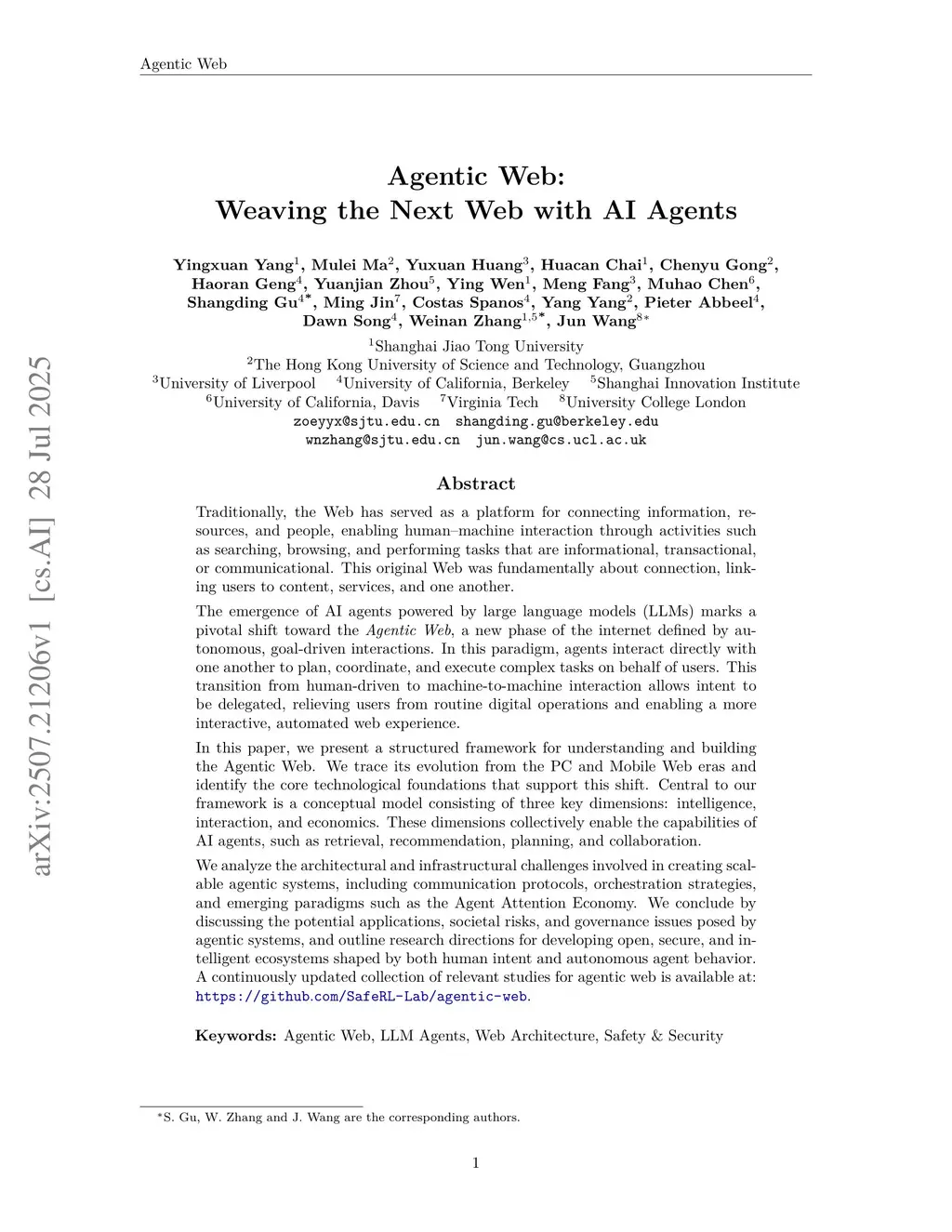 The emergence of AI agents powered by large language models (LLMs) marks a pivotal shift toward the Agentic Web, a new phase of the internet defined by autonomous, goal-driven interactions. In this paradigm, agents interact directly with one another to plan, coordinate, and execute complex tasks on behalf of users. This transition from human-driven to machine-to-machine interaction allows intent to be delegated, relieving users from routine digital operations and enabling a more interactive, automated web experience. In this paper, we present a structured framework for understanding and building the Agentic Web. We trace its evolution from the PC and Mobile Web eras and identify the core technological foundations that support this shift. Central to our framework is a conceptual model consisting of three key dimensions: intelligence, interaction, and economics. These dimensions collectively enable the capabilities of AI agents, such as retrieval, recommendation, planning, and collaboration. We analyze the architectural and infrastructural challenges involved in creating scalable agentic systems, including communication protocols, orchestration strategies, and emerging paradigms such as the Agent Attention Economy. We conclude by discussing the potential applications, societal risks, and governance issues posed by agentic systems, and outline research directions for developing open, secure, and intelligent ecosystems shaped by both human intent and autonomous agent behavior. A continuously updated collection of relevant studies for agentic web is available at:this https URL.