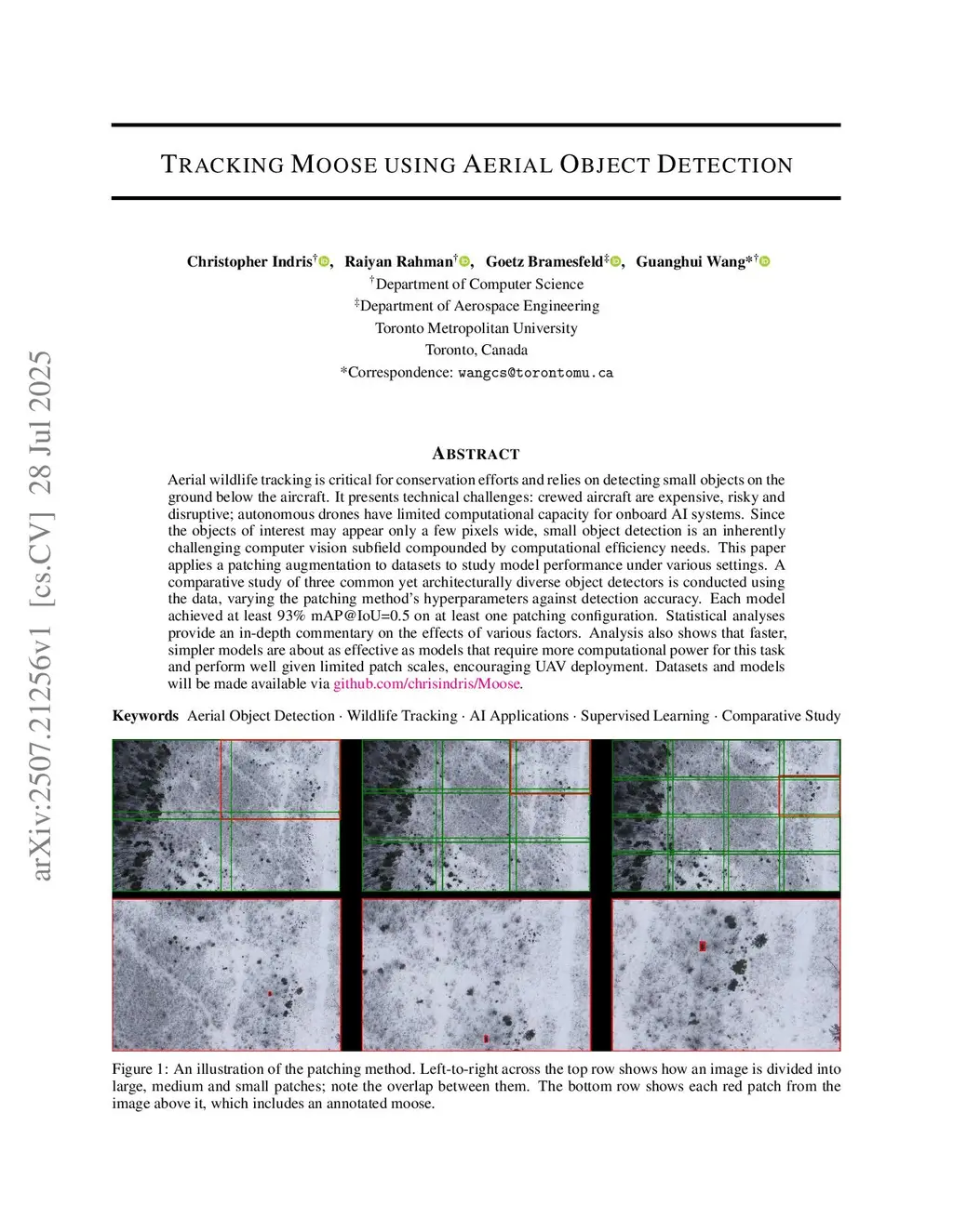 Aerial wildlife tracking is critical for conservation efforts and relies on detecting small objects on the ground below the aircraft. It presents technical challenges: crewed aircraft are expensive, risky and disruptive; autonomous drones have limited computational capacity for onboard AI systems. Since the objects of interest may appear only a few pixels wide, small object detection is an inherently challenging computer vision subfield compounded by computational efficiency needs. This paper applies a patching augmentation to datasets to study model performance under various settings. A comparative study of three common yet architecturally diverse object detectors is conducted using the data, varying the patching method's hyperparameters against detection accuracy. Each model achieved at least 93\% mAP@IoU=0.5 on at least one patching configuration. Statistical analyses provide an in-depth commentary on the effects of various factors. Analysis also shows that faster, simpler models are about as effective as models that require more computational power for this task and perform well given limited patch scales, encouraging UAV deployment. Datasets and models will be made available viathis https URL.