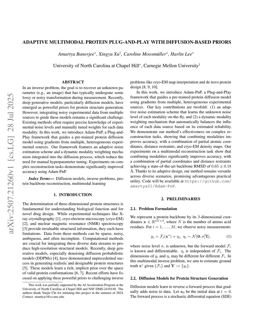 In an inverse problem, the goal is to recover an unknown parameter (e.g., an image) that has typically undergone some lossy or noisy transformation during measurement. Recently, deep generative models, particularly diffusion models, have emerged as powerful priors for protein structure generation. However, integrating noisy experimental data from multiple sources to guide these models remains a significant challenge. Existing methods often require precise knowledge of experimental noise levels and manually tuned weights for each data modality. In this work, we introduce Adam-PnP, a Plug-and-Play framework that guides a pre-trained protein diffusion model using gradients from multiple, heterogeneous experimental sources. Our framework features an adaptive noise estimation scheme and a dynamic modality weighting mechanism integrated into the diffusion process, which reduce the need for manual hyperparameter tuning. Experiments on complex reconstruction tasks demonstrate significantly improved accuracy using Adam-PnP.