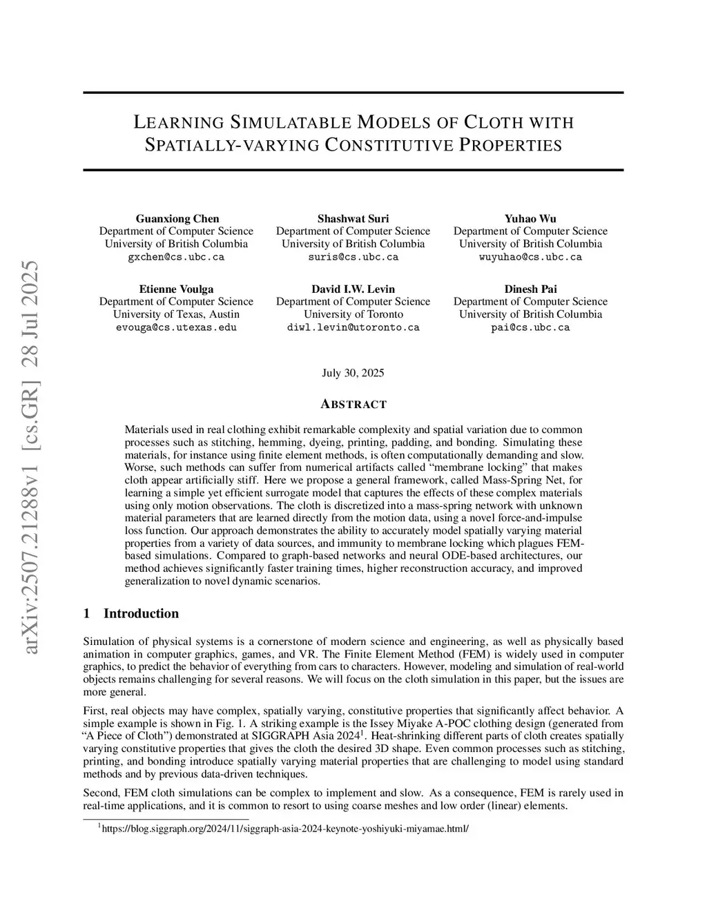 Materials used in real clothing exhibit remarkable complexity and spatial variation due to common processes such as stitching, hemming, dyeing, printing, padding, and bonding. Simulating these materials, for instance using finite element methods, is often computationally demanding and slow. Worse, such methods can suffer from numerical artifacts called ``membrane locking'' that makes cloth appear artificially stiff. Here we propose a general framework, called Mass-Spring Net, for learning a simple yet efficient surrogate model that captures the effects of these complex materials using only motion observations. The cloth is discretized into a mass-spring network with unknown material parameters that are learned directly from the motion data, using a novel force-and-impulse loss function. Our approach demonstrates the ability to accurately model spatially varying material properties from a variety of data sources, and immunity to membrane locking which plagues FEM-based simulations. Compared to graph-based networks and neural ODE-based architectures, our method achieves significantly faster training times, higher reconstruction accuracy, and improved generalization to novel dynamic scenarios.