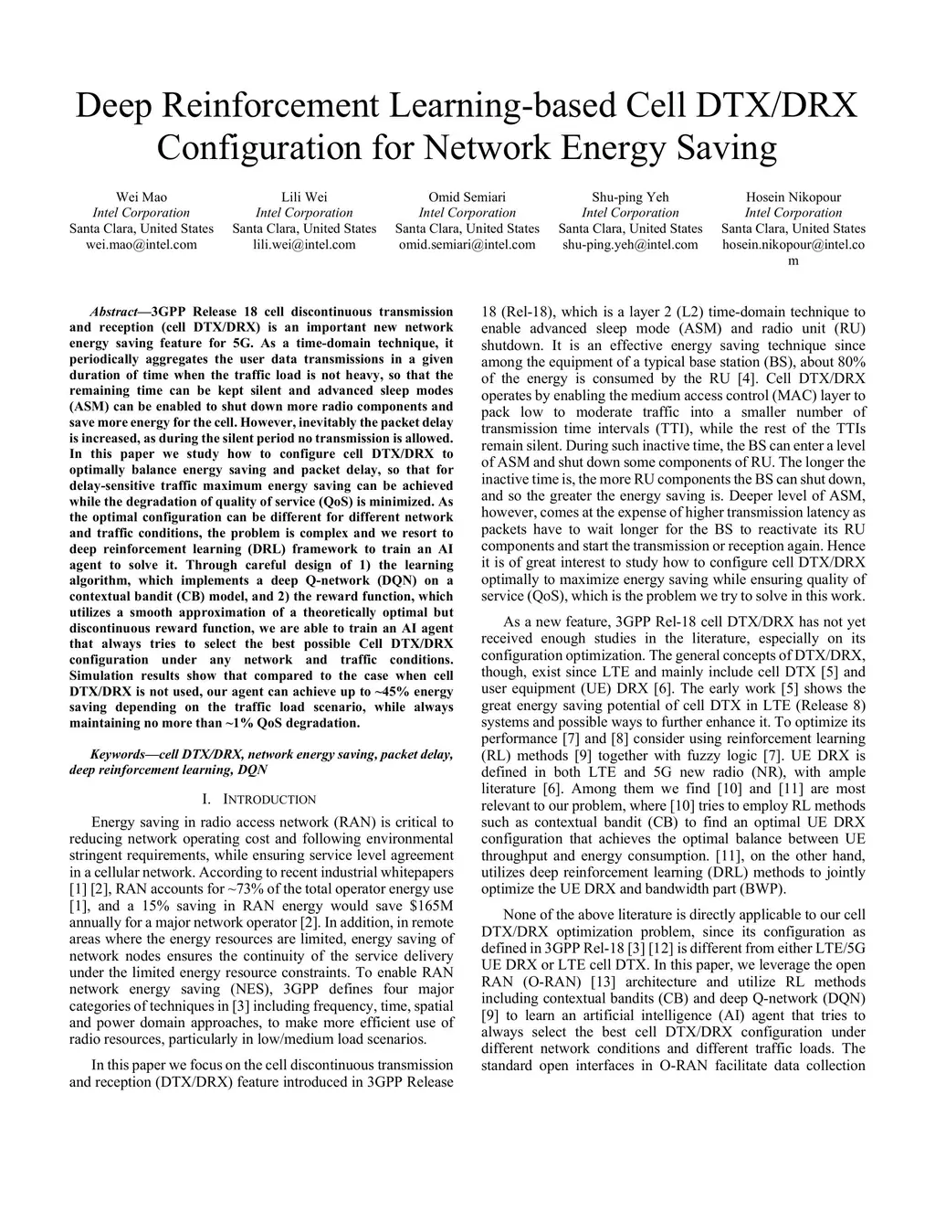 3GPP Release 18 cell discontinuous transmission and reception (cell DTX/DRX) is an important new network energy saving feature for 5G. As a time-domain technique, it periodically aggregates the user data transmissions in a given duration of time when the traffic load is not heavy, so that the remaining time can be kept silent and advanced sleep modes (ASM) can be enabled to shut down more radio components and save more energy for the cell. However, inevitably the packet delay is increased, as during the silent period no transmission is allowed. In this paper we study how to configure cell DTX/DRX to optimally balance energy saving and packet delay, so that for delay-sensitive traffic maximum energy saving can be achieved while the degradation of quality of service (QoS) is minimized. As the optimal configuration can be different for different network and traffic conditions, the problem is complex and we resort to deep reinforcement learning (DRL) framework to train an AI agent to solve it. Through careful design of 1) the learning algorithm, which implements a deep Q-network (DQN) on a contextual bandit (CB) model, and 2) the reward function, which utilizes a smooth approximation of a theoretically optimal but discontinuous reward function, we are able to train an AI agent that always tries to select the best possible Cell DTX/DRX configuration under any network and traffic conditions. Simulation results show that compared to the case when cell DTX/DRX is not used, our agent can achieve up to ~45% energy saving depending on the traffic load scenario, while always maintaining no more than ~1% QoS degradation.