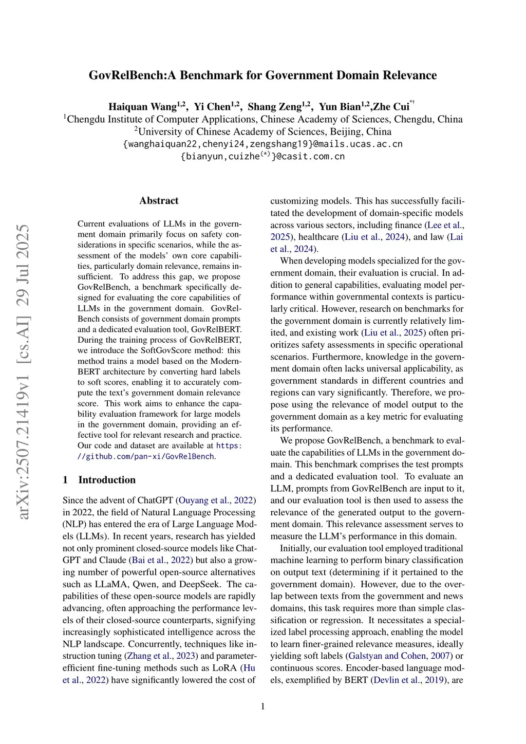 Current evaluations of LLMs in the government domain primarily focus on safety considerations in specific scenarios, while the assessment of the models' own core capabilities, particularly domain relevance, remains insufficient. To address this gap, we propose GovRelBench, a benchmark specifically designed for evaluating the core capabilities of LLMs in the government domain. GovRelBench consists of government domain prompts and a dedicated evaluation tool, GovRelBERT. During the training process of GovRelBERT, we introduce the SoftGovScore method: this method trains a model based on the ModernBERT architecture by converting hard labels to soft scores, enabling it to accurately compute the text's government domain relevance score. This work aims to enhance the capability evaluation framework for large models in the government domain, providing an effective tool for relevant research and practice. Our code and dataset are available atthis https URL.