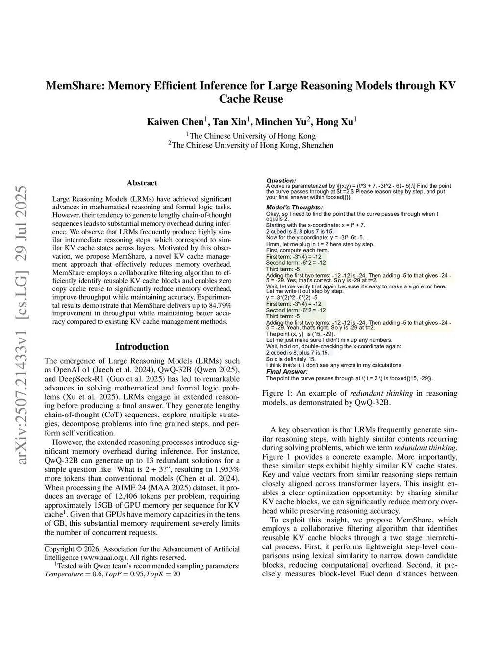 Large Reasoning Models (LRMs) have achieved significant advances in mathematical reasoning and formal logic tasks. However, their tendency to generate lengthy chain-of-thought sequences leads to substantial memory overhead during inference. We observe that LRMs frequently produce highly similar intermediate reasoning steps, which correspond to similar KV cache states across layers. Motivated by this observation, we propose MemShare, a novel KV cache management approach that effectively reduces memory overhead. MemShare employs a collaborative filtering algorithm to efficiently identify reusable KV cache blocks and enables zero copy cache reuse to significantly reduce memory overhead, improve throughput while maintaining accuracy. Experimental results demonstrate that MemShare delivers up to 84.79\% improvement in throughput while maintaining better accuracy compared to existing KV cache management methods.