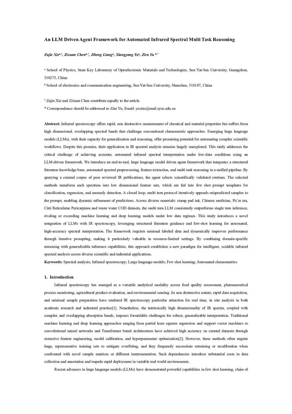 Infrared spectroscopy enables rapid, non destructive analysis of chemical and material properties, yet high dimensional signals and overlapping bands hinder conventional chemometric methods. Large language models (LLMs), with strong generalization and reasoning capabilities, offer new opportunities for automated spectral interpretation, but their potential in this domain remains largely untapped. This study introduces LUMIR (LLM-driven Unified agent framework for Multi-task Infrared spectroscopy Reasoning), an agent based framework designed to achieve accurate infrared spectral analysis under low data conditions. LUMIR integrates a structured literature knowledge base, automated preprocessing, feature extraction, and predictive modeling into a unified pipeline. By mining peer reviewed spectroscopy studies, it identifies validated preprocessing and feature derivation strategies, transforms spectra into low dimensional representations, and applies few-shot prompts for classification, regression, and anomaly detection. The framework was validated on diverse datasets, including the publicly available Milk near-infrared dataset, Chinese medicinal herbs, Citri Reticulatae Pericarpium(CRP) with different storage durations, an industrial wastewater COD dataset, and two additional public benchmarks, Tecator and Corn. Across these tasks, LUMIR achieved performance comparable to or surpassing established machine learning and deep learning models, particularly in resource limited settings. This work demonstrates that combining structured literature guidance with few-shot learning enables robust, scalable, and automated spectral interpretation. LUMIR establishes a new paradigm for applying LLMs to infrared spectroscopy, offering high accuracy with minimal labeled data and broad applicability across scientific and industrial domains.