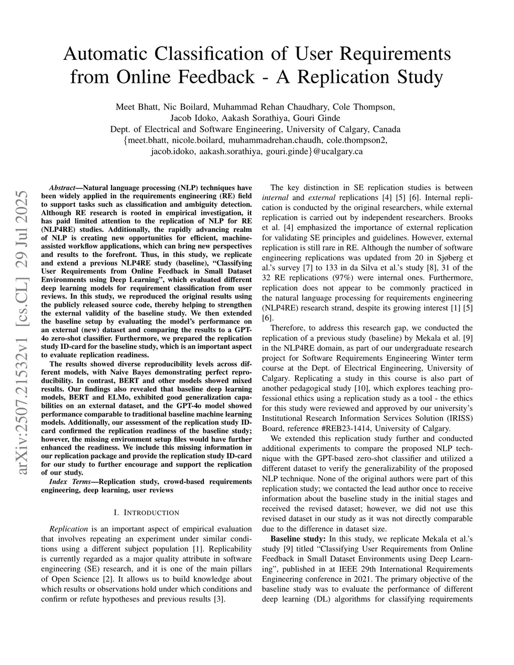 Natural language processing (NLP) techniques have been widely applied in the requirements engineering (RE) field to support tasks such as classification and ambiguity detection. Although RE research is rooted in empirical investigation, it has paid limited attention to replicating NLP for RE (NLP4RE) studies. The rapidly advancing realm of NLP is creating new opportunities for efficient, machine-assisted workflows, which can bring new perspectives and results to the forefront. Thus, we replicate and extend a previous NLP4RE study (baseline), "Classifying User Requirements from Online Feedback in Small Dataset Environments using Deep Learning", which evaluated different deep learning models for requirement classification from user reviews. We reproduced the original results using publicly released source code, thereby helping to strengthen the external validity of the baseline study. We then extended the setup by evaluating model performance on an external dataset and comparing results to a GPT-4o zero-shot classifier. Furthermore, we prepared the replication study ID-card for the baseline study, important for evaluating replication readiness. Results showed diverse reproducibility levels across different models, with Naive Bayes demonstrating perfect reproducibility. In contrast, BERT and other models showed mixed results. Our findings revealed that baseline deep learning models, BERT and ELMo, exhibited good generalization capabilities on an external dataset, and GPT-4o showed performance comparable to traditional baseline machine learning models. Additionally, our assessment confirmed the baseline study's replication readiness; however missing environment setup files would have further enhanced readiness. We include this missing information in our replication package and provide the replication study ID-card for our study to further encourage and support the replication of our study.