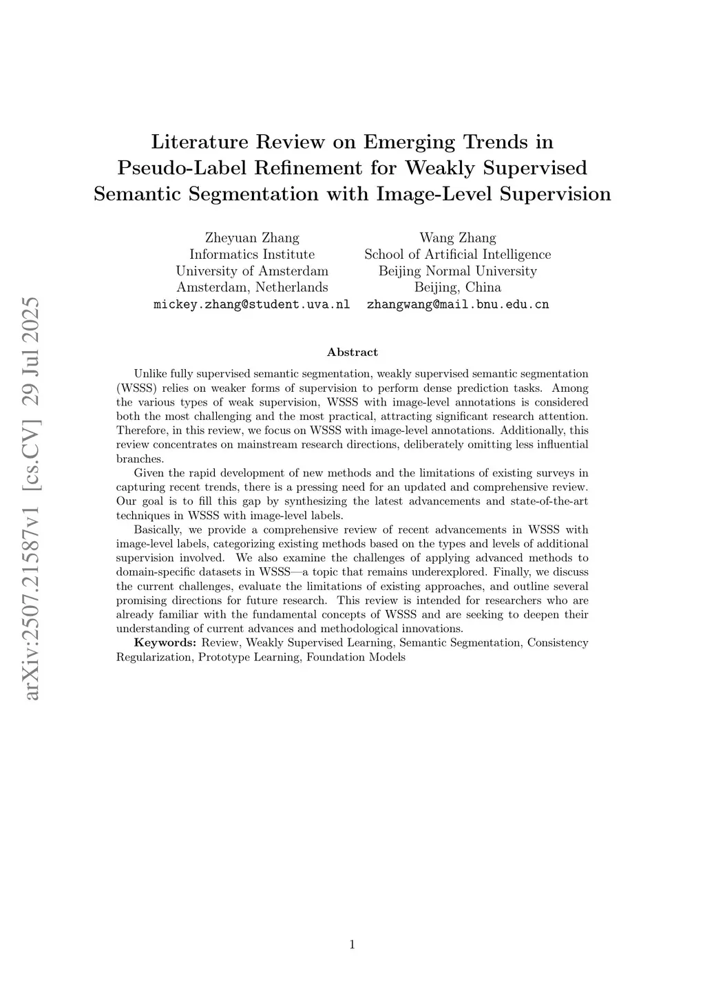 Unlike fully supervised semantic segmentation, weakly supervised semantic segmentation (WSSS) relies on weaker forms of supervision to perform dense prediction tasks. Among the various types of weak supervision, WSSS with image level annotations is considered both the most challenging and the most practical, attracting significant research attention. Therefore, in this review, we focus on WSSS with image level annotations. Additionally, this review concentrates on mainstream research directions, deliberately omitting less influential branches.Given the rapid development of new methods and the limitations of existing surveys in capturing recent trends, there is a pressing need for an updated and comprehensive review. Our goal is to fill this gap by synthesizing the latest advancements and state-of-the-art techniques in WSSS with image level labels.Basically, we provide a comprehensive review of recent advancements in WSSS with image level labels, categorizing existing methods based on the types and levels of additional supervision involved. We also examine the challenges of applying advanced methods to domain specific datasets in WSSS,a topic that remains underexplored. Finally, we discuss the current challenges, evaluate the limitations of existing approaches, and outline several promising directions for future research. This review is intended for researchers who are already familiar with the fundamental concepts of WSSS and are seeking to deepen their understanding of current advances and methodological innovations.