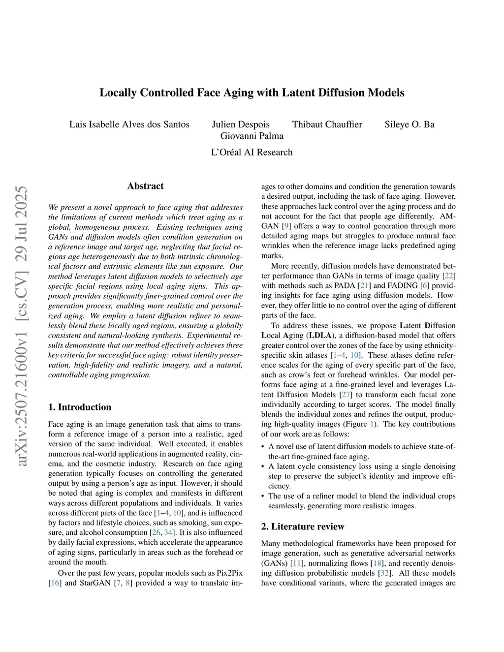 We present a novel approach to face aging that addresses the limitations of current methods which treat aging as a global, homogeneous process. Existing techniques using GANs and diffusion models often condition generation on a reference image and target age, neglecting that facial regions age heterogeneously due to both intrinsic chronological factors and extrinsic elements like sun exposure. Our method leverages latent diffusion models to selectively age specific facial regions using local aging signs. This approach provides significantly finer-grained control over the generation process, enabling more realistic and personalized aging. We employ a latent diffusion refiner to seamlessly blend these locally aged regions, ensuring a globally consistent and natural-looking synthesis. Experimental results demonstrate that our method effectively achieves three key criteria for successful face aging: robust identity preservation, high-fidelity and realistic imagery, and a natural, controllable aging progression.