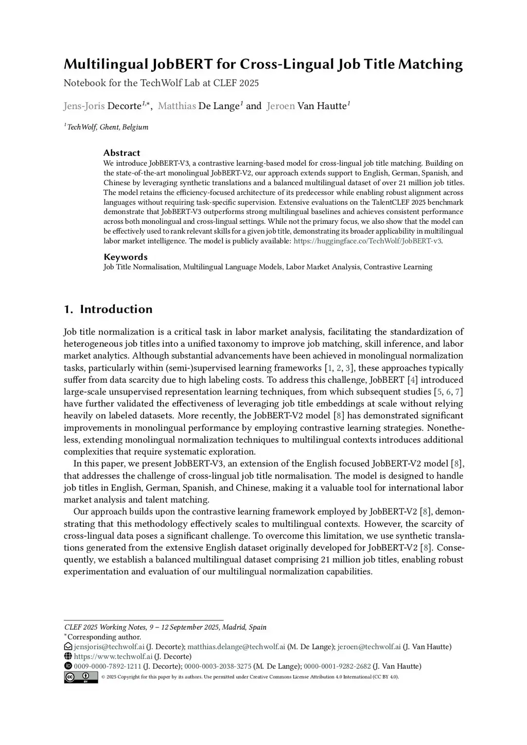 We introduce JobBERT-V3, a contrastive learning-based model for cross-lingual job title matching. Building on the state-of-the-art monolingual JobBERT-V2, our approach extends support to English, German, Spanish, and Chinese by leveraging synthetic translations and a balanced multilingual dataset of over 21 million job titles. The model retains the efficiency-focused architecture of its predecessor while enabling robust alignment across languages without requiring task-specific supervision. Extensive evaluations on the TalentCLEF 2025 benchmark demonstrate that JobBERT-V3 outperforms strong multilingual baselines and achieves consistent performance across both monolingual and cross-lingual settings. While not the primary focus, we also show that the model can be effectively used to rank relevant skills for a given job title, demonstrating its broader applicability in multilingual labor market intelligence. The model is publicly available:this https URL.