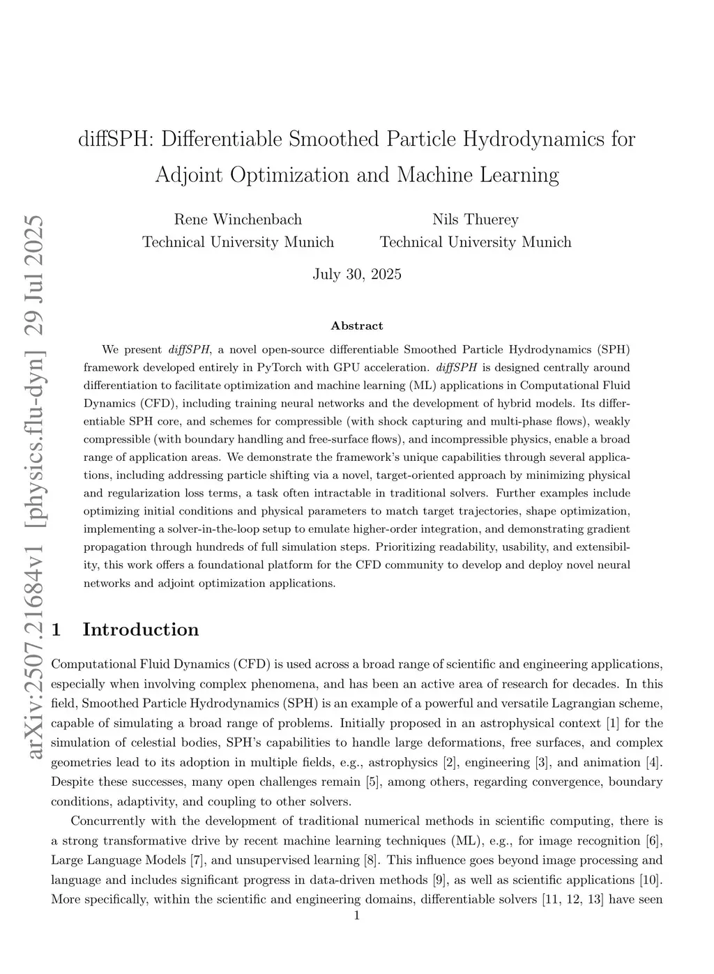We present diffSPH, a novel open-source differentiable Smoothed Particle Hydrodynamics (SPH) framework developed entirely in PyTorch with GPU acceleration. diffSPH is designed centrally around differentiation to facilitate optimization and machine learning (ML) applications in Computational Fluid Dynamics~(CFD), including training neural networks and the development of hybrid models. Its differentiable SPH core, and schemes for compressible (with shock capturing and multi-phase flows), weakly compressible (with boundary handling and free-surface flows), and incompressible physics, enable a broad range of application areas. We demonstrate the framework's unique capabilities through several applications, including addressing particle shifting via a novel, target-oriented approach by minimizing physical and regularization loss terms, a task often intractable in traditional solvers. Further examples include optimizing initial conditions and physical parameters to match target trajectories, shape optimization, implementing a solver-in-the-loop setup to emulate higher-order integration, and demonstrating gradient propagation through hundreds of full simulation steps. Prioritizing readability, usability, and extensibility, this work offers a foundational platform for the CFD community to develop and deploy novel neural networks and adjoint optimization applications.