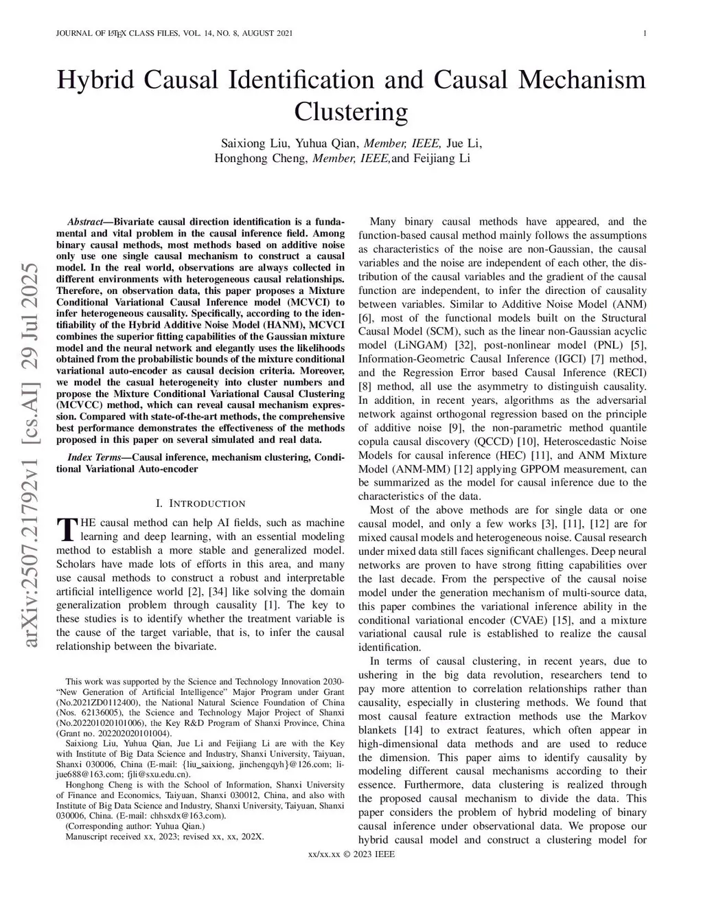 Bivariate causal direction identification is a fundamental and vital problem in the causal inference field. Among binary causal methods, most methods based on additive noise only use one single causal mechanism to construct a causal model. In the real world, observations are always collected in different environments with heterogeneous causal relationships. Therefore, on observation data, this paper proposes a Mixture Conditional Variational Causal Inference model (MCVCI) to infer heterogeneous causality. Specifically, according to the identifiability of the Hybrid Additive Noise Model (HANM), MCVCI combines the superior fitting capabilities of the Gaussian mixture model and the neural network and elegantly uses the likelihoods obtained from the probabilistic bounds of the mixture conditional variational auto-encoder as causal decision criteria. Moreover, we model the casual heterogeneity into cluster numbers and propose the Mixture Conditional Variational Causal Clustering (MCVCC) method, which can reveal causal mechanism expression. Compared with state-of-the-art methods, the comprehensive best performance demonstrates the effectiveness of the methods proposed in this paper on several simulated and real data.