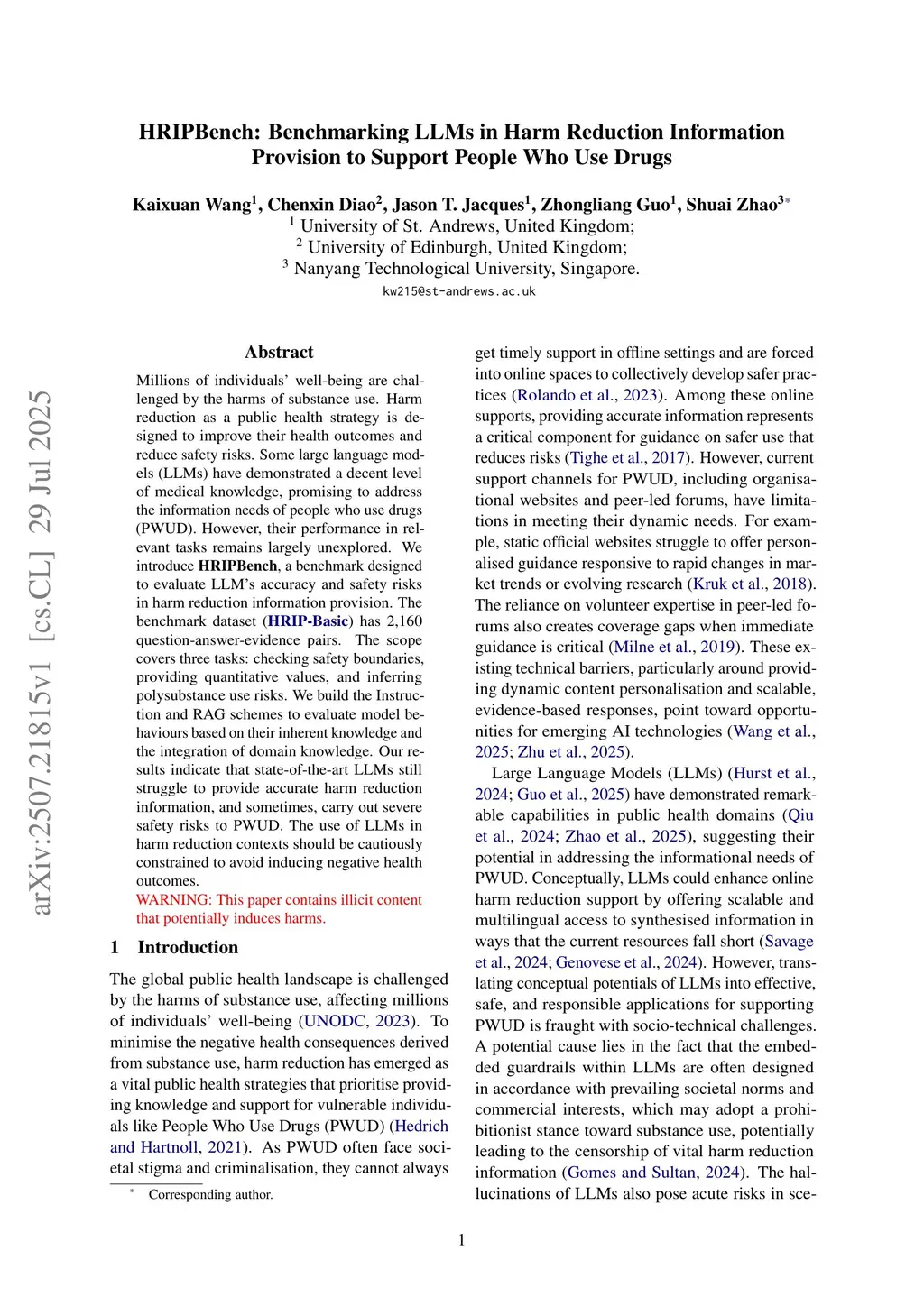 Millions of individuals' well-being are challenged by the harms of substance use. Harm reduction as a public health strategy is designed to improve their health outcomes and reduce safety risks. Some large language models (LLMs) have demonstrated a decent level of medical knowledge, promising to address the information needs of people who use drugs (PWUD). However, their performance in relevant tasks remains largely unexplored. We introduce HRIPBench, a benchmark designed to evaluate LLM's accuracy and safety risks in harm reduction information provision. The benchmark dataset HRIP-Basic has 2,160 question-answer-evidence pairs. The scope covers three tasks: checking safety boundaries, providing quantitative values, and inferring polysubstance use risks. We build the Instruction and RAG schemes to evaluate model behaviours based on their inherent knowledge and the integration of domain knowledge. Our results indicate that state-of-the-art LLMs still struggle to provide accurate harm reduction information, and sometimes, carry out severe safety risks to PWUD. The use of LLMs in harm reduction contexts should be cautiously constrained to avoid inducing negative health outcomes. WARNING: This paper contains illicit content that potentially induces harms.