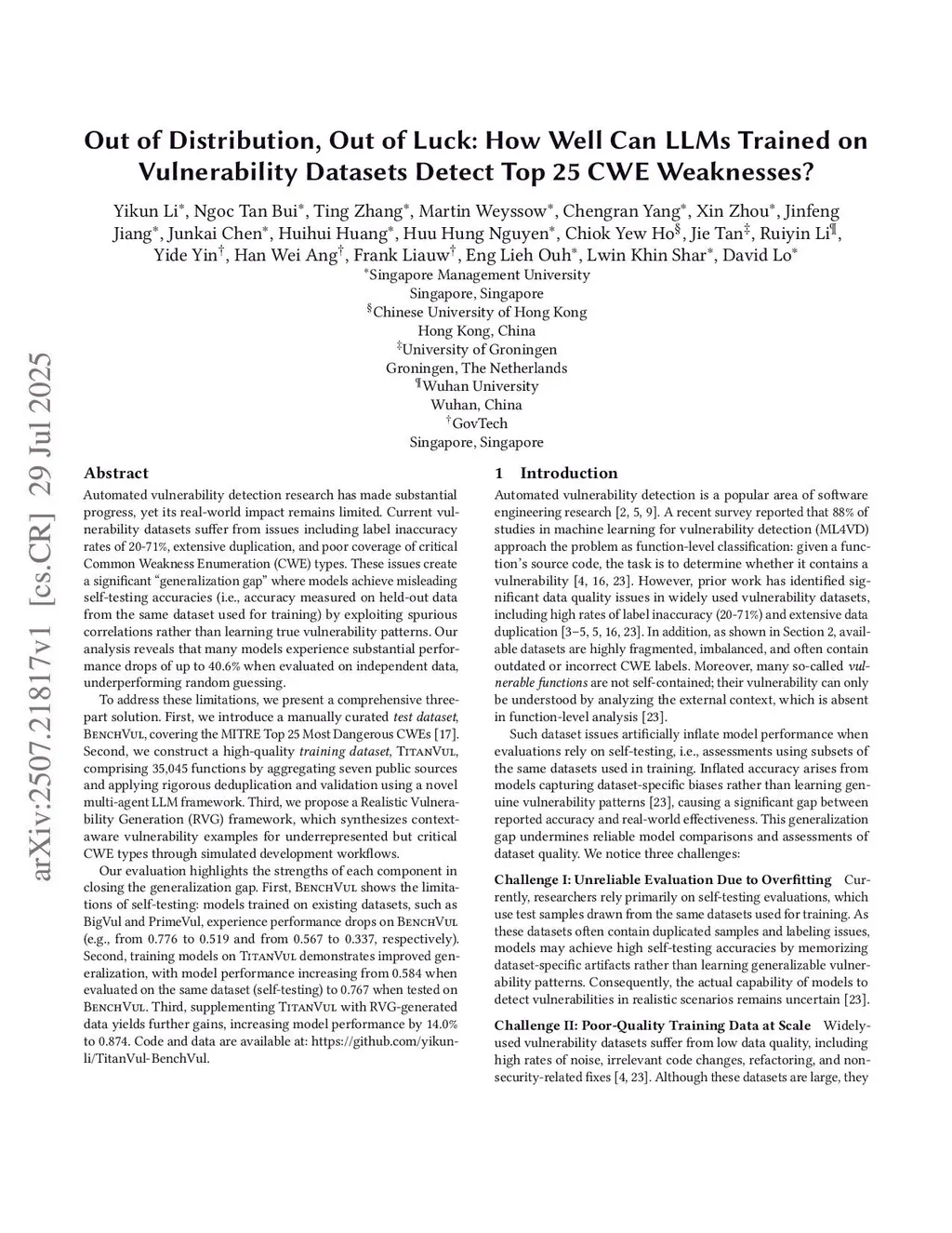 Out of Distribution, Out of Luck: How Well Can LLMs Trained on Vulnerability Datasets Detect Top 25 CWE Weaknesses?