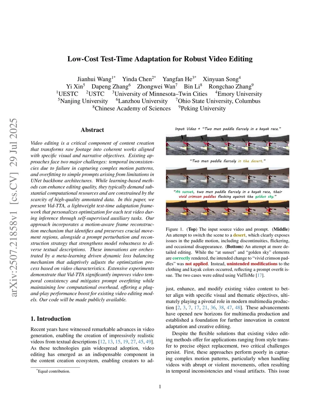 Video editing is a critical component of content creation that transforms raw footage into coherent works aligned with specific visual and narrative objectives. Existing approaches face two major challenges: temporal inconsistencies due to failure in capturing complex motion patterns, and overfitting to simple prompts arising from limitations in UNet backbone architectures. While learning-based methods can enhance editing quality, they typically demand substantial computational resources and are constrained by the scarcity of high-quality annotated data. In this paper, we present Vid-TTA, a lightweight test-time adaptation framework that personalizes optimization for each test video during inference through self-supervised auxiliary tasks. Our approach incorporates a motion-aware frame reconstruction mechanism that identifies and preserves crucial movement regions, alongside a prompt perturbation and reconstruction strategy that strengthens model robustness to diverse textual descriptions. These innovations are orchestrated by a meta-learning driven dynamic loss balancing mechanism that adaptively adjusts the optimization process based on video characteristics. Extensive experiments demonstrate that Vid-TTA significantly improves video temporal consistency and mitigates prompt overfitting while maintaining low computational overhead, offering a plug-and-play performance boost for existing video editing models.