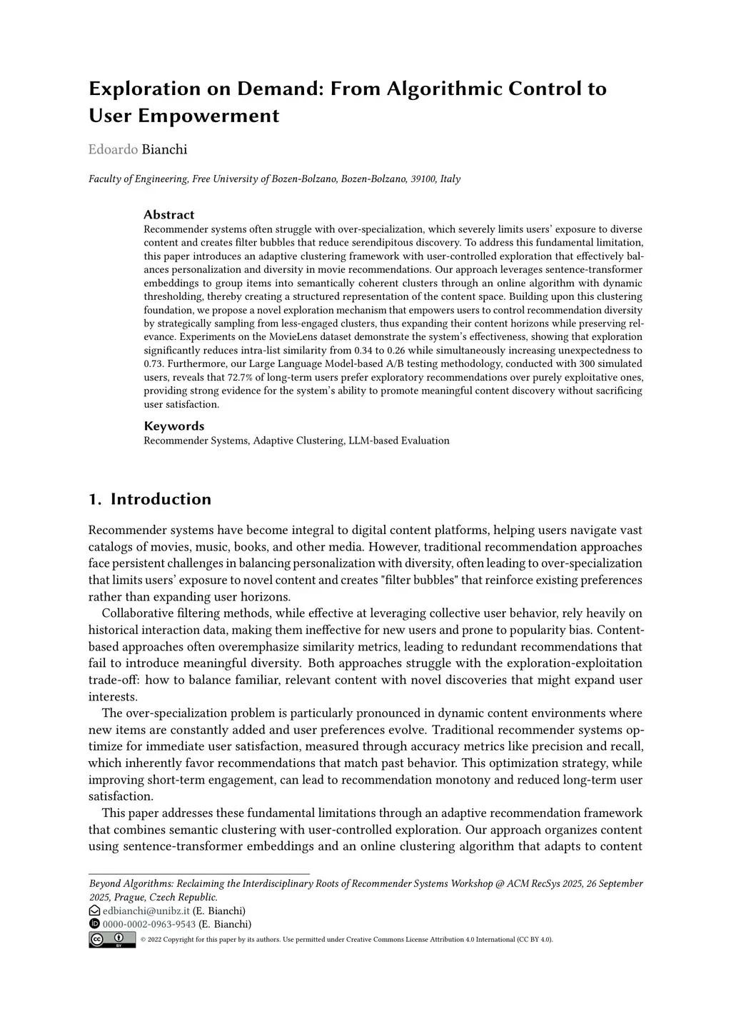 Recommender systems often struggle with over-specialization, which severely limits users' exposure to diverse content and creates filter bubbles that reduce serendipitous discovery. To address this fundamental limitation, this paper introduces an adaptive clustering framework with user-controlled exploration that effectively balances personalization and diversity in movie recommendations. Our approach leverages sentence-transformer embeddings to group items into semantically coherent clusters through an online algorithm with dynamic thresholding, thereby creating a structured representation of the content space. Building upon this clustering foundation, we propose a novel exploration mechanism that empowers users to control recommendation diversity by strategically sampling from less-engaged clusters, thus expanding their content horizons while preserving relevance. Experiments on the MovieLens dataset demonstrate the system's effectiveness, showing that exploration significantly reduces intra-list similarity from 0.34 to 0.26 while simultaneously increasing unexpectedness to 0.73. Furthermore, our Large Language Model-based A/B testing methodology, conducted with 300 simulated users, reveals that 72.7% of long-term users prefer exploratory recommendations over purely exploitative ones, providing strong evidence for the system's ability to promote meaningful content discovery without sacrificing user satisfaction.