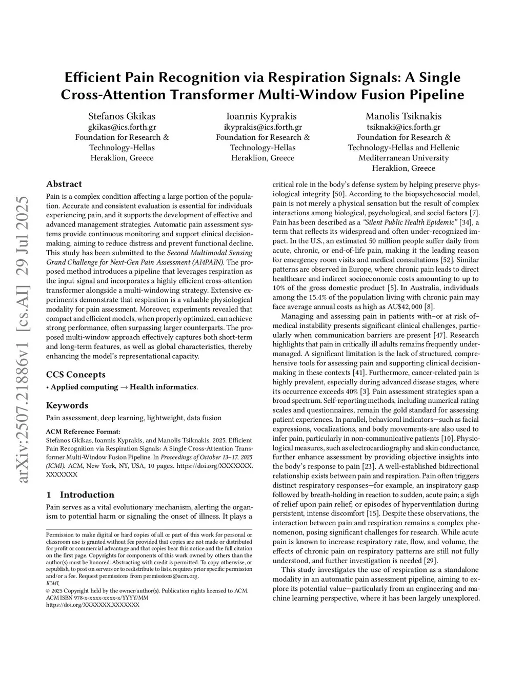 Pain is a complex condition that affects a large portion of the population. Accurate and consistent evaluation is essential for individuals experiencing pain and supports the development of effective and advanced management strategies. Automatic pain assessment systems provide continuous monitoring, aid clinical decision-making, and aim to reduce distress while preventing functional decline. This study has been submitted to the Second Multimodal Sensing Grand Challenge for Next-Gen Pain Assessment (AI4PAIN). The proposed method introduces a pipeline that employs respiration as the input signal and integrates a highly efficient cross-attention transformer with a multi-windowing strategy. Extensive experiments demonstrate that respiration serves as a valuable physiological modality for pain assessment. Furthermore, results show that compact and efficient models, when properly optimized, can deliver strong performance, often surpassing larger counterparts. The proposed multi-window strategy effectively captures short-term and long-term features, along with global characteristics, enhancing the model's representational capacity.