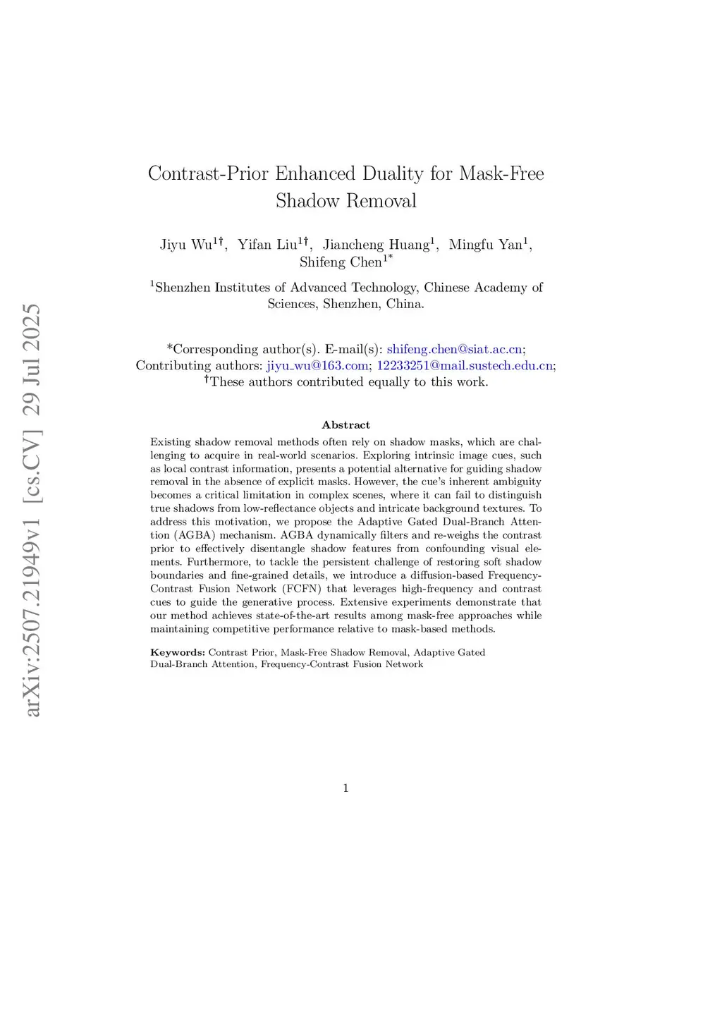 Existing shadow removal methods often rely on shadow masks, which are challenging to acquire in real-world scenarios. Exploring intrinsic image cues, such as local contrast information, presents a potential alternative for guiding shadow removal in the absence of explicit masks. However, the cue's inherent ambiguity becomes a critical limitation in complex scenes, where it can fail to distinguish true shadows from low-reflectance objects and intricate background textures. To address this motivation, we propose the Adaptive Gated Dual-Branch Attention (AGBA) mechanism. AGBA dynamically filters and re-weighs the contrast prior to effectively disentangle shadow features from confounding visual elements. Furthermore, to tackle the persistent challenge of restoring soft shadow boundaries and fine-grained details, we introduce a diffusion-based Frequency-Contrast Fusion Network (FCFN) that leverages high-frequency and contrast cues to guide the generative process. Extensive experiments demonstrate that our method achieves state-of-the-art results among mask-free approaches while maintaining competitive performance relative to mask-based methods.