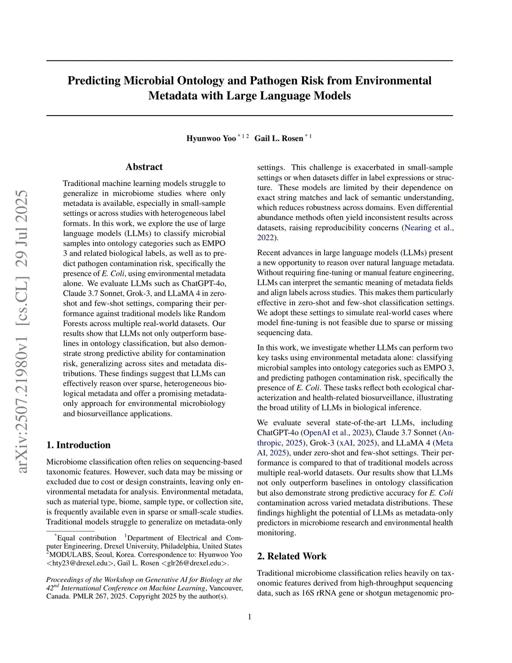 Traditional machine learning models struggle to generalize in microbiome studies where only metadata is available, especially in small-sample settings or across studies with heterogeneous label formats. In this work, we explore the use of large language models (LLMs) to classify microbial samples into ontology categories such as EMPO 3 and related biological labels, as well as to predict pathogen contamination risk, specifically the presence of E. Coli, using environmental metadata alone. We evaluate LLMs such as ChatGPT-4o, Claude 3.7 Sonnet, Grok-3, and LLaMA 4 in zero-shot and few-shot settings, comparing their performance against traditional models like Random Forests across multiple real-world datasets. Our results show that LLMs not only outperform baselines in ontology classification, but also demonstrate strong predictive ability for contamination risk, generalizing across sites and metadata distributions. These findings suggest that LLMs can effectively reason over sparse, heterogeneous biological metadata and offer a promising metadata-only approach for environmental microbiology and biosurveillance applications.