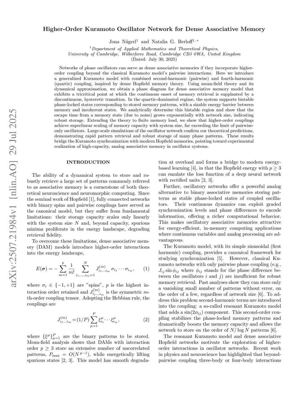 Higher-Order Kuramoto Oscillator Network for Dense Associative Memory