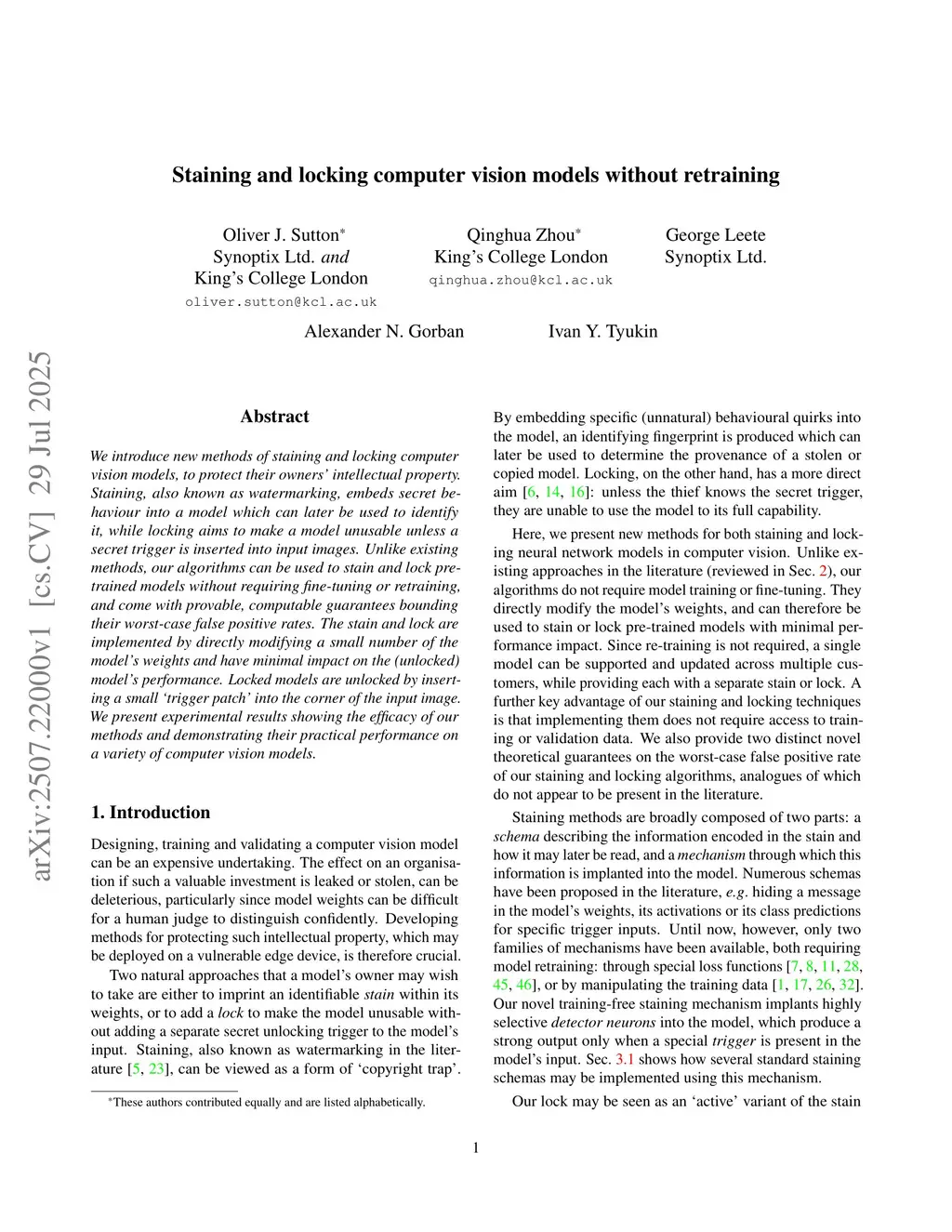 Staining and locking computer vision models without retraining
