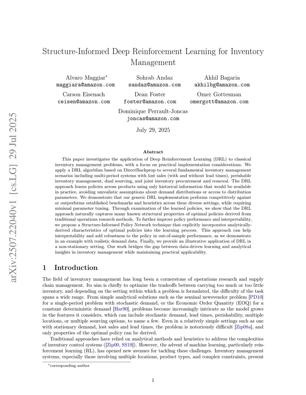 This paper investigates the application of Deep Reinforcement Learning (DRL) to classical inventory management problems, with a focus on practical implementation considerations. We apply a DRL algorithm based on DirectBackprop to several fundamental inventory management scenarios including multi-period systems with lost sales (with and without lead times), perishable inventory management, dual sourcing, and joint inventory procurement and removal. The DRL approach learns policies across products using only historical information that would be available in practice, avoiding unrealistic assumptions about demand distributions or access to distribution parameters. We demonstrate that our generic DRL implementation performs competitively against or outperforms established benchmarks and heuristics across these diverse settings, while requiring minimal parameter tuning. Through examination of the learned policies, we show that the DRL approach naturally captures many known structural properties of optimal policies derived from traditional operations research methods. To further improve policy performance and interpretability, we propose a Structure-Informed Policy Network technique that explicitly incorporates analytically-derived characteristics of optimal policies into the learning process. This approach can help interpretability and add robustness to the policy in out-of-sample performance, as we demonstrate in an example with realistic demand data. Finally, we provide an illustrative application of DRL in a non-stationary setting. Our work bridges the gap between data-driven learning and analytical insights in inventory management while maintaining practical applicability.