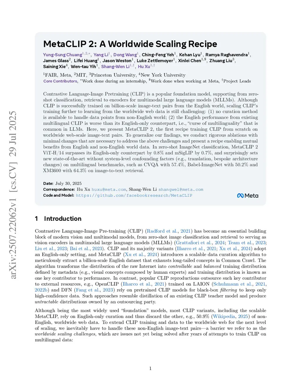 Meta CLIP 2: A Worldwide Scaling Recipe