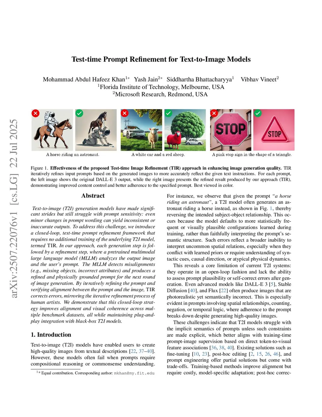 Text-to-image (T2I) generation models have made significant strides but still struggle with prompt sensitivity: even minor changes in prompt wording can yield inconsistent or inaccurate outputs. To address this challenge, we introduce a closed-loop, test-time prompt refinement framework that requires no additional training of the underlying T2I model, termed TIR. In our approach, each generation step is followed by a refinement step, where a pretrained multimodal large language model (MLLM) analyzes the output image and the user's prompt. The MLLM detects misalignments (e.g., missing objects, incorrect attributes) and produces a refined and physically grounded prompt for the next round of image generation. By iteratively refining the prompt and verifying alignment between the prompt and the image, TIR corrects errors, mirroring the iterative refinement process of human artists. We demonstrate that this closed-loop strategy improves alignment and visual coherence across multiple benchmark datasets, all while maintaining plug-and-play integration with black-box T2I models.