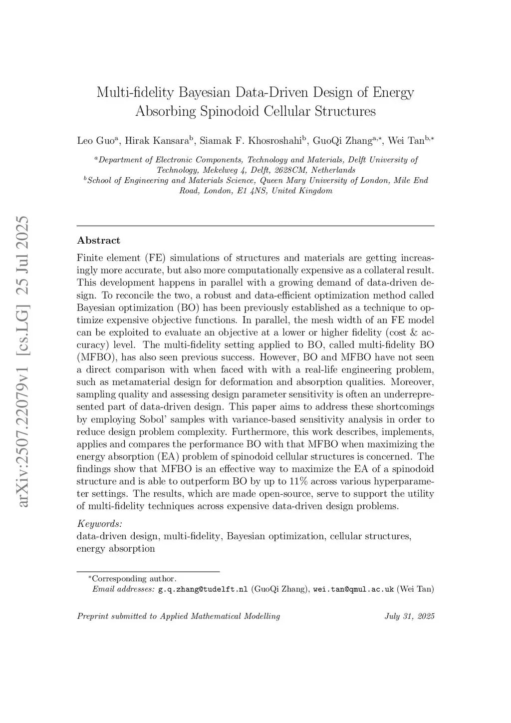 Finite element (FE) simulations of structures and materials are getting increasingly more accurate, but also more computationally expensive as a collateral result. This development happens in parallel with a growing demand of data-driven design. To reconcile the two, a robust and data-efficient optimization method called Bayesian optimization (BO) has been previously established as a technique to optimize expensive objective functions. In parallel, the mesh width of an FE model can be exploited to evaluate an objective at a lower or higher fidelity (cost & accuracy) level. The multi-fidelity setting applied to BO, called multi-fidelity BO (MFBO), has also seen previous success. However, BO and MFBO have not seen a direct comparison with when faced with with a real-life engineering problem, such as metamaterial design for deformation and absorption qualities. Moreover, sampling quality and assessing design parameter sensitivity is often an underrepresented part of data-driven design. This paper aims to address these shortcomings by employing Sobol' samples with variance-based sensitivity analysis in order to reduce design problem complexity. Furthermore, this work describes, implements, applies and compares the performance BO with that MFBO when maximizing the energy absorption (EA) problem of spinodoid cellular structures is concerned. The findings show that MFBO is an effective way to maximize the EA of a spinodoid structure and is able to outperform BO by up to 11% across various hyperparameter settings. The results, which are made open-source, serve to support the utility of multi-fidelity techniques across expensive data-driven design problems.