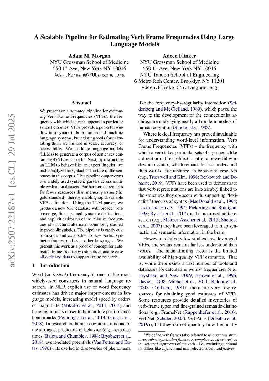 We present an automated pipeline for estimating Verb Frame Frequencies (VFFs), the frequency with which a verb appears in particular syntactic frames. VFFs provide a powerful window into syntax in both human and machine language systems, but existing tools for calculating them are limited in scale, accuracy, or accessibility. We use large language models (LLMs) to generate a corpus of sentences containing 476 English verbs. Next, by instructing an LLM to behave like an expert linguist, we had it analyze the syntactic structure of the sentences in this corpus. This pipeline outperforms two widely used syntactic parsers across multiple evaluation datasets. Furthermore, it requires far fewer resources than manual parsing (the gold-standard), thereby enabling rapid, scalable VFF estimation. Using the LLM parser, we produce a new VFF database with broader verb coverage, finer-grained syntactic distinctions, and explicit estimates of the relative frequencies of structural alternates commonly studied in psycholinguistics. The pipeline is easily customizable and extensible to new verbs, syntactic frames, and even other languages. We present this work as a proof of concept for automated frame frequency estimation, and release all code and data to support future research.