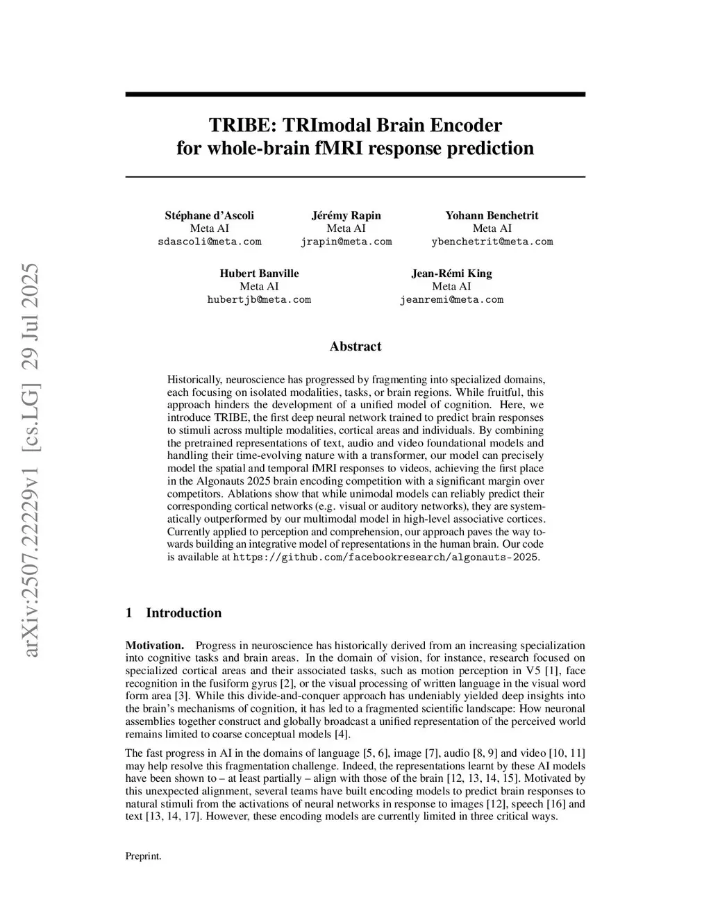 Historically, neuroscience has progressed by fragmenting into specialized domains, each focusing on isolated modalities, tasks, or brain regions. While fruitful, this approach hinders the development of a unified model of cognition. Here, we introduce TRIBE, the first deep neural network trained to predict brain responses to stimuli across multiple modalities, cortical areas and individuals. By combining the pretrained representations of text, audio and video foundational models and handling their time-evolving nature with a transformer, our model can precisely model the spatial and temporal fMRI responses to videos, achieving the first place in the Algonauts 2025 brain encoding competition with a significant margin over competitors. Ablations show that while unimodal models can reliably predict their corresponding cortical networks (e.g. visual or auditory networks), they are systematically outperformed by our multimodal model in high-level associative cortices. Currently applied to perception and comprehension, our approach paves the way towards building an integrative model of representations in the human brain. Our code is available atthis https URL.