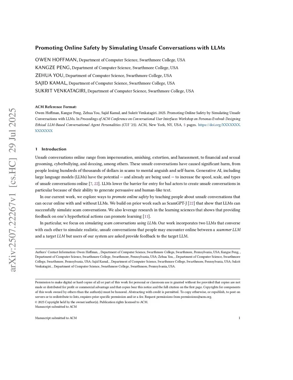 Generative AI, including large language models (LLMs) have the potential -- and already are being used -- to increase the speed, scale, and types of unsafe conversations online. LLMs lower the barrier for entry for bad actors to create unsafe conversations in particular because of their ability to generate persuasive and human-like text. In our current work, we explore ways to promote online safety by teaching people about unsafe conversations that can occur online with and without LLMs. We build on prior work that shows that LLMs can successfully simulate scam conversations. We also leverage research in the learning sciences that shows that providing feedback on one's hypothetical actions can promote learning. In particular, we focus on simulating scam conversations using LLMs. Our work incorporates two LLMs that converse with each other to simulate realistic, unsafe conversations that people may encounter online between a scammer LLM and a target LLM but users of our system are asked provide feedback to the target LLM.