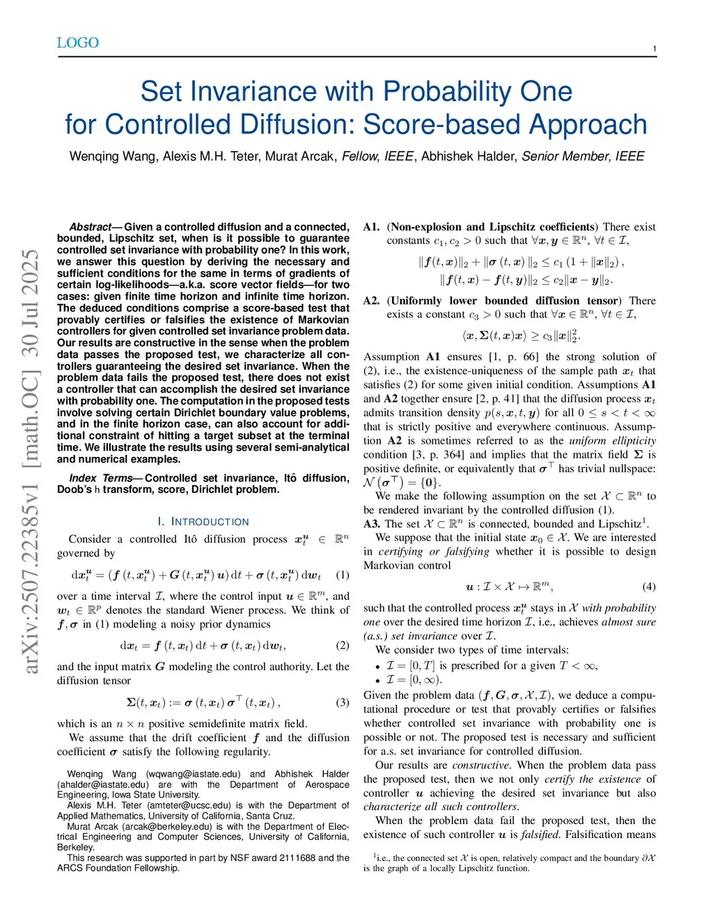 Given a controlled diffusion and a connected, bounded, Lipschitz set, when is it possible to guarantee controlled set invariance with probability one? In this work, we answer this question by deriving the necessary and sufficient conditions for the same in terms of gradients of certain log-likelihoods -- a.k.a. score vector fields -- for two cases: given finite time horizon and infinite time horizon. The deduced conditions comprise a score-based test that provably certifies or falsifies the existence of Markovian controllers for given controlled set invariance problem data. Our results are constructive in the sense when the problem data passes the proposed test, we characterize all controllers guaranteeing the desired set invariance. When the problem data fails the proposed test, there does not exist a controller that can accomplish the desired set invariance with probability one. The computation in the proposed tests involve solving certain Dirichlet boundary value problems, and in the finite horizon case, can also account for additional constraint of hitting a target subset at the terminal time. We illustrate the results using several semi-analytical and numerical examples.
